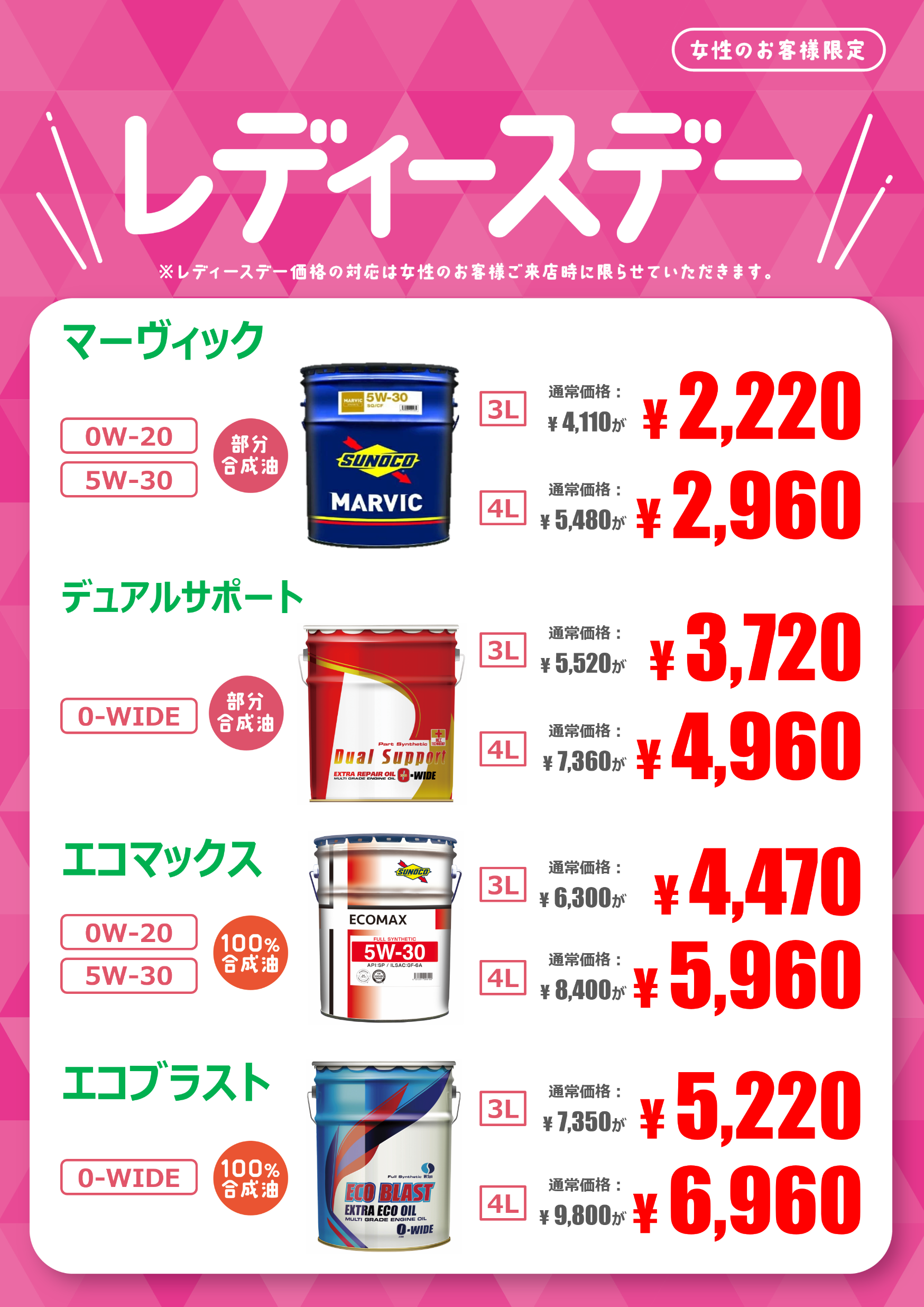 火曜日と木曜日は女性のお客様限定でオイル交換がお得にできる