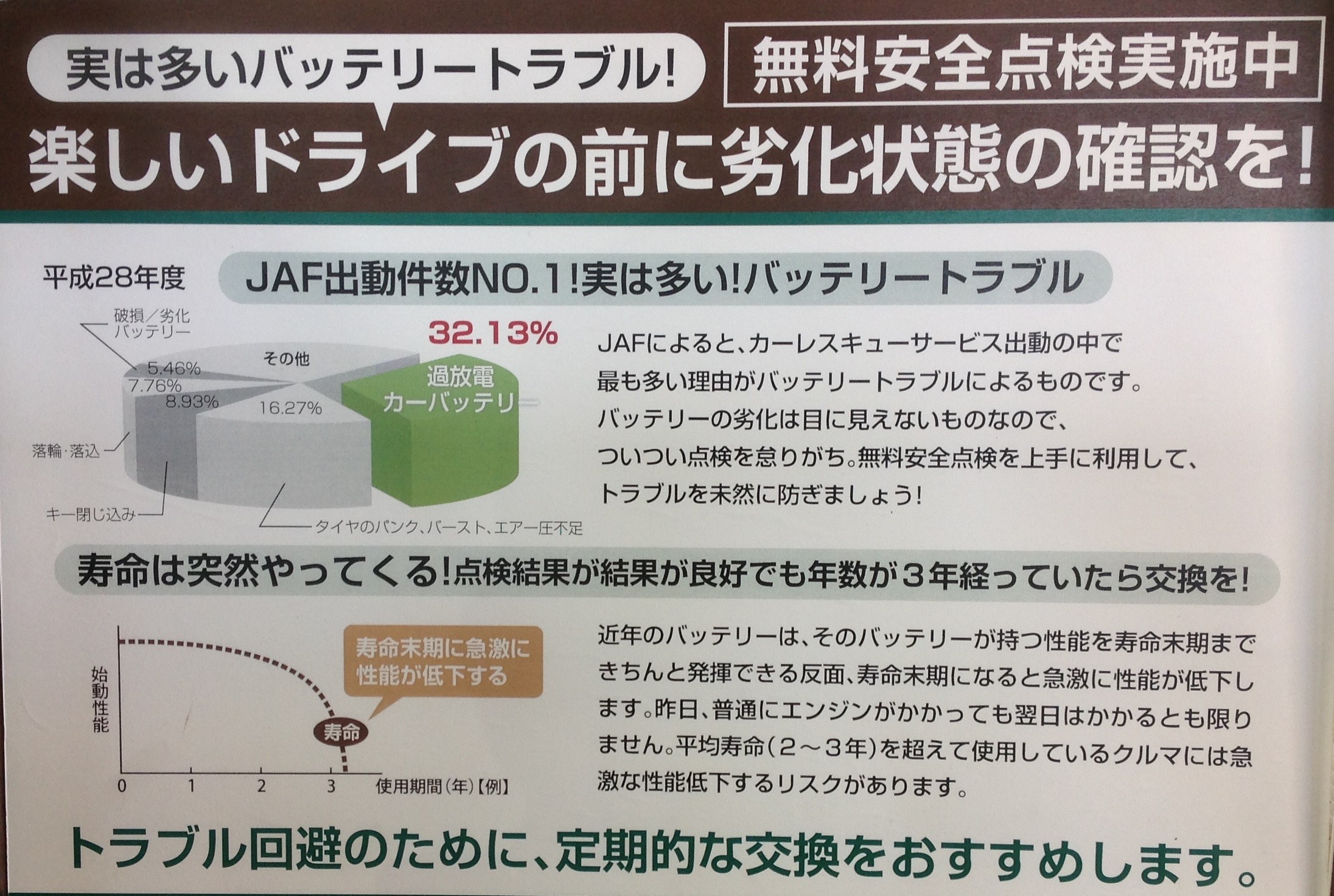 GWお出かけですか? ポスト 2019年4月19日 今年のGWは長い方で10連勤と長いお休みですね。。。 お車でお出かけの方もいらっしゃると思いますが、 お車のご準備はいかがでしょうか? タイヤ空気圧をはじめ、エンジンオイル、バッテリなど 当店では、無料安全点検を実施しております。 お出かけ前に、ぜひ当店で点検されてはいかがでしょうか? タグ:安全点検、バッテリー、エンジンオイル、無料 担当:加藤