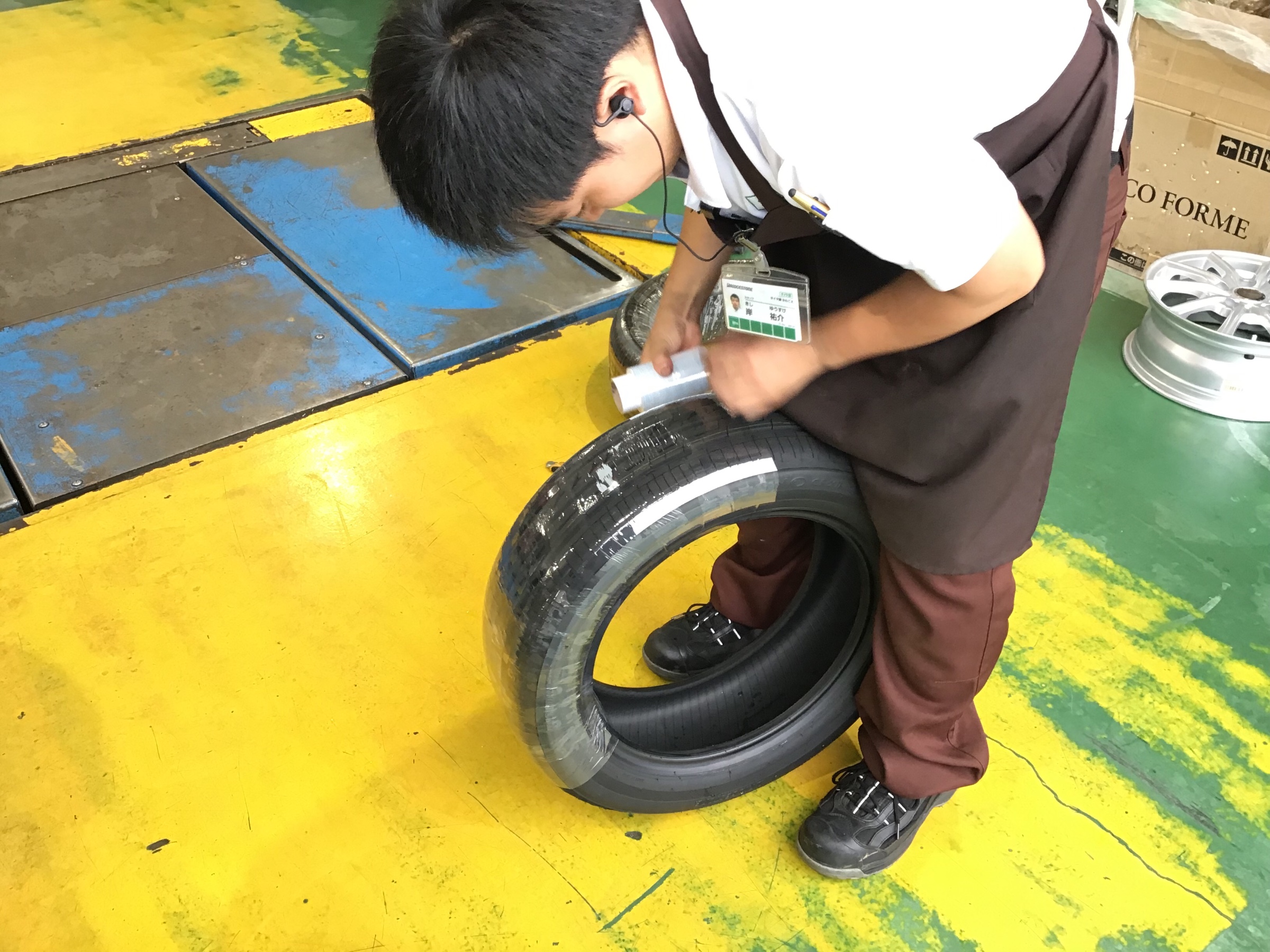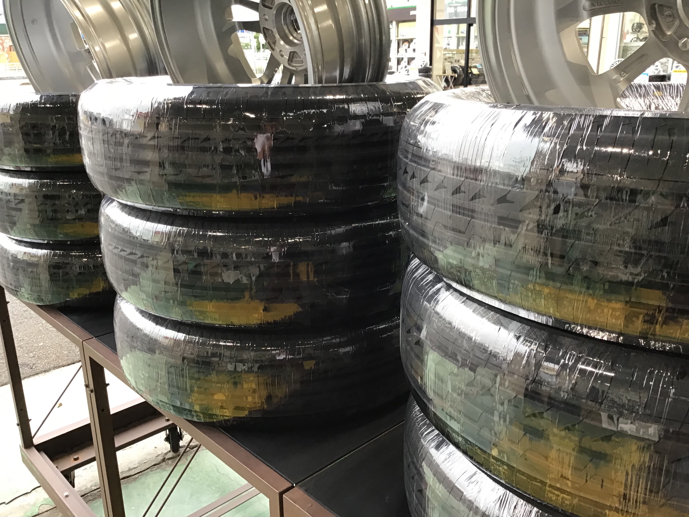 新人の岸 スタッフがタイヤのラップ巻きです。