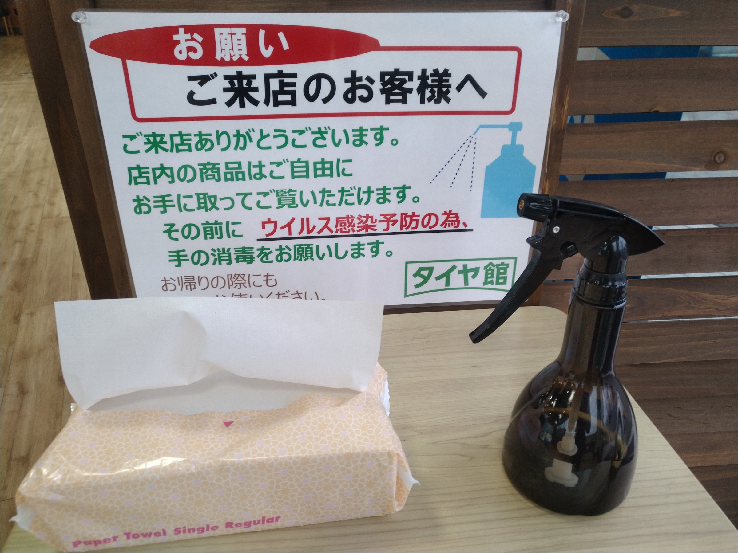 当店ではウイルス感染予防の為店舗入り口にアルコール消毒を設置しております。
