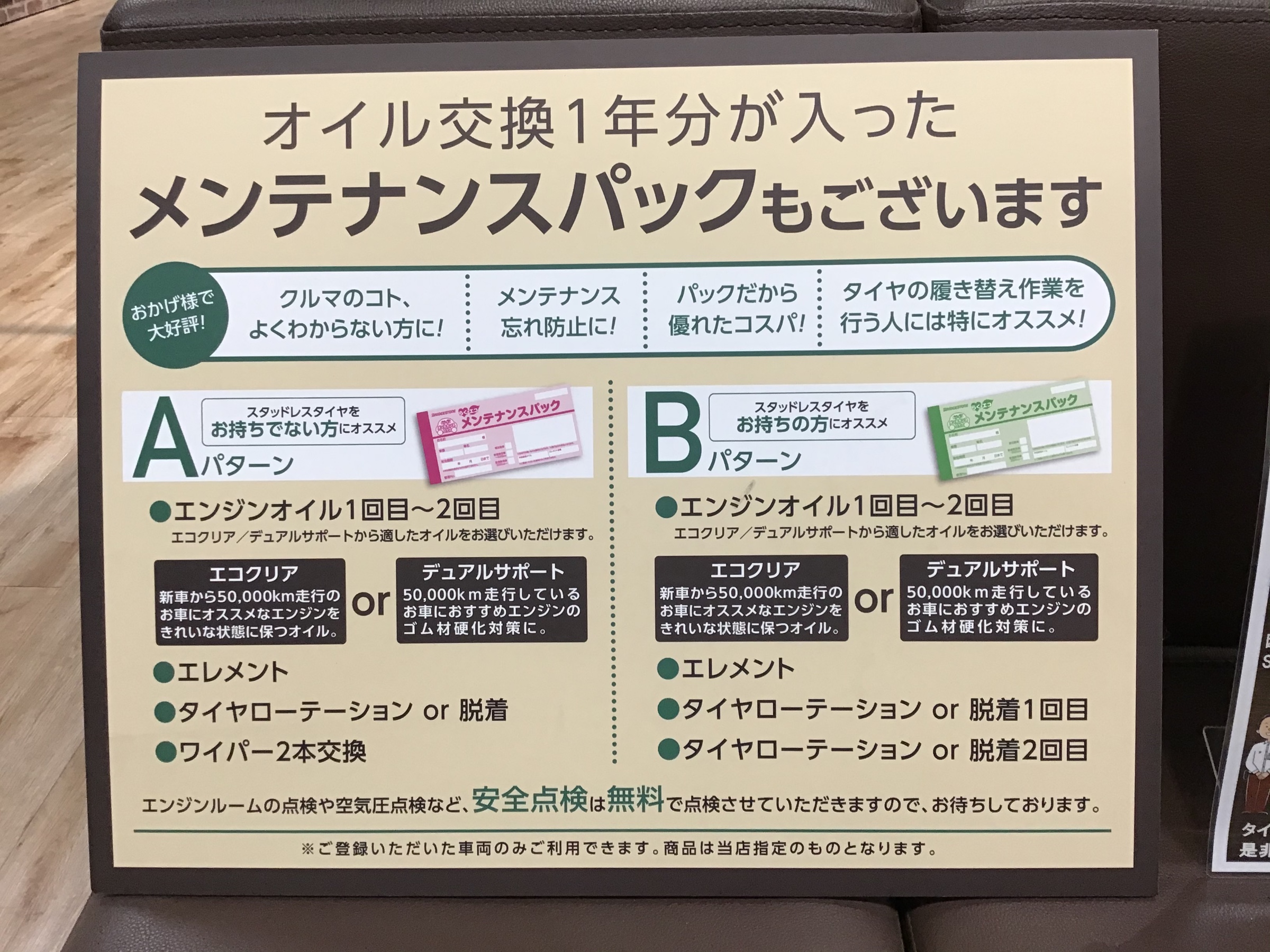 お得なメンテナンスパック♬ ポスト 2020年4月21日 こんばんは。 スタッフ日記を見ていただきありがとうございます。 タイヤ館ではお得なメンテナンスパックがあります。 年にオイル交換を2回やる方にはオススメなパックになっております! 普通にやるよりはとてもお得です! 内容はこんな感じになっています! ご不明な点などぜひスタッフに聞いていただければと思います! お待ちしております! 担当:畑中