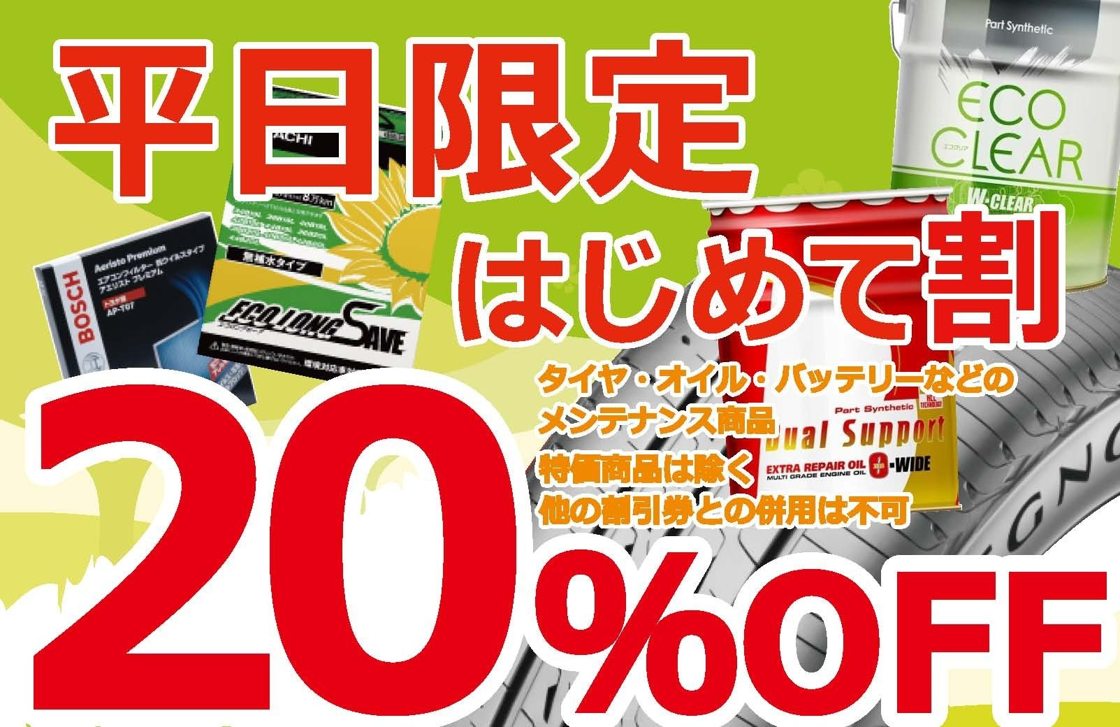 はじめての方限定! おトクにデビューのチャンスです! \平日限定 はじめて割 実施中!/ タイヤ館アプリに登録して タイヤ館かわごえに初めてご来店いただきますと... タイヤ・オイル・バッテリーなどのメンテナンス商品が な、な、なんと20%OFF!! (※特価商品は対象外/他の割引券との併用...