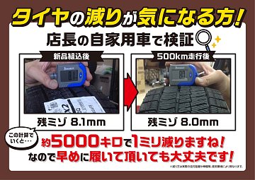 いつも当店をご利用いただきありがとうございます! 今回はスタッドレスタイヤの慣らし走行についてのお話です。 皆さんはタイヤの慣らし走行についてご存じですか? ブリヂストンのタイヤカタログには 夏タイヤの場合:80km/h以下の速度で100km以上 冬タイヤの場合:60km/h以下の速度で200km以上 ...
