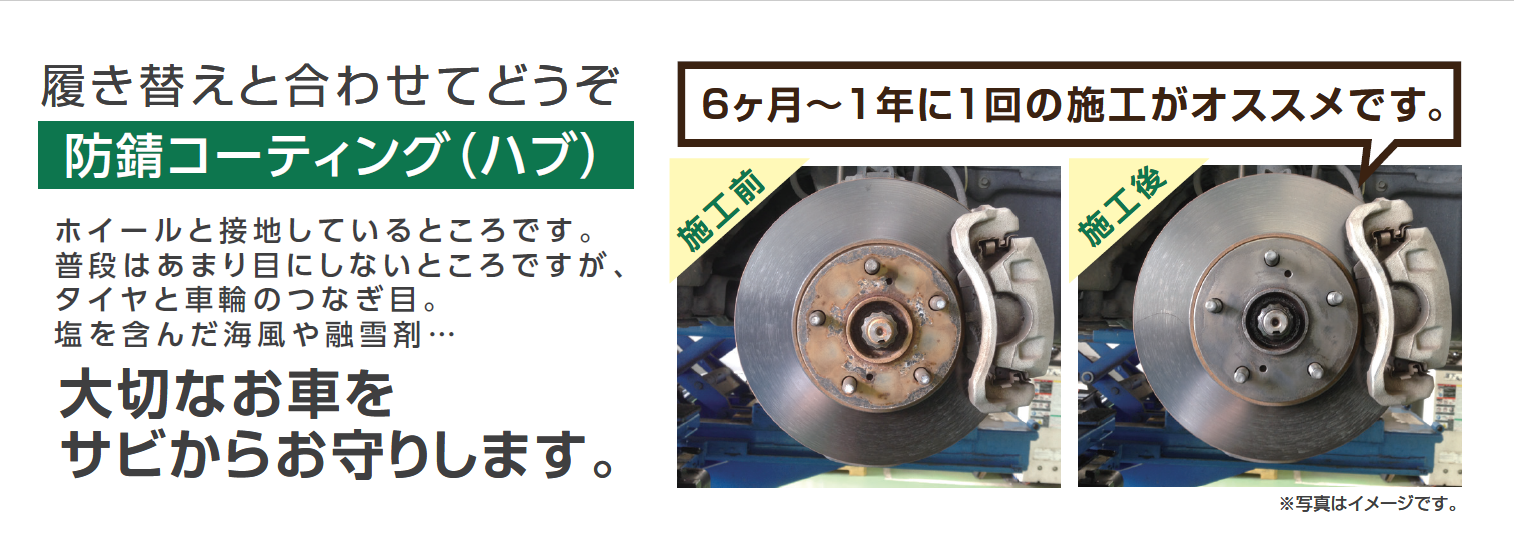 タイヤ館かわごえのホームページをご覧の皆様 こんにちは・こんばんは! いつもご覧いただきありがとうございます!! 【防サビ・下回り】 車体下回り等に専用溶液を塗布することで錆の進行を抑制します。 下回り全般の金属部分はもとより、ドライブシャフト、プロペラシャフトといった可動部分や、...