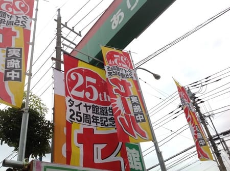 本日より開催です! ポスト 2016年7月16日 さいたま市大宮区天沼町タイヤ館さいたま新都心のスタッフHがお伝えします。本日より25周年誕生祭第2弾開催です!天気は不安定な3連休になりそうですが、気温も低めなので行楽にもいい感じですね。お出掛けされない方は動きやすい陽気の時に是非タイヤ館にもご来店くださいませ。お出掛け前の点検も大歓迎です!ゲリラ豪雨もあるかもですので、安全第一でお車の準備は整えておきましょう!