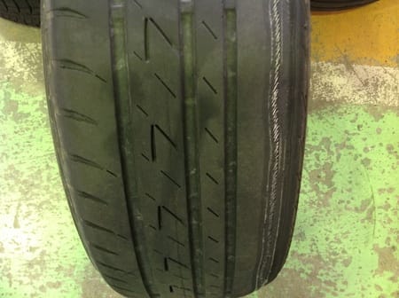 偏摩耗してますよね〜。100%とは言えませんがアライメントがズレてる