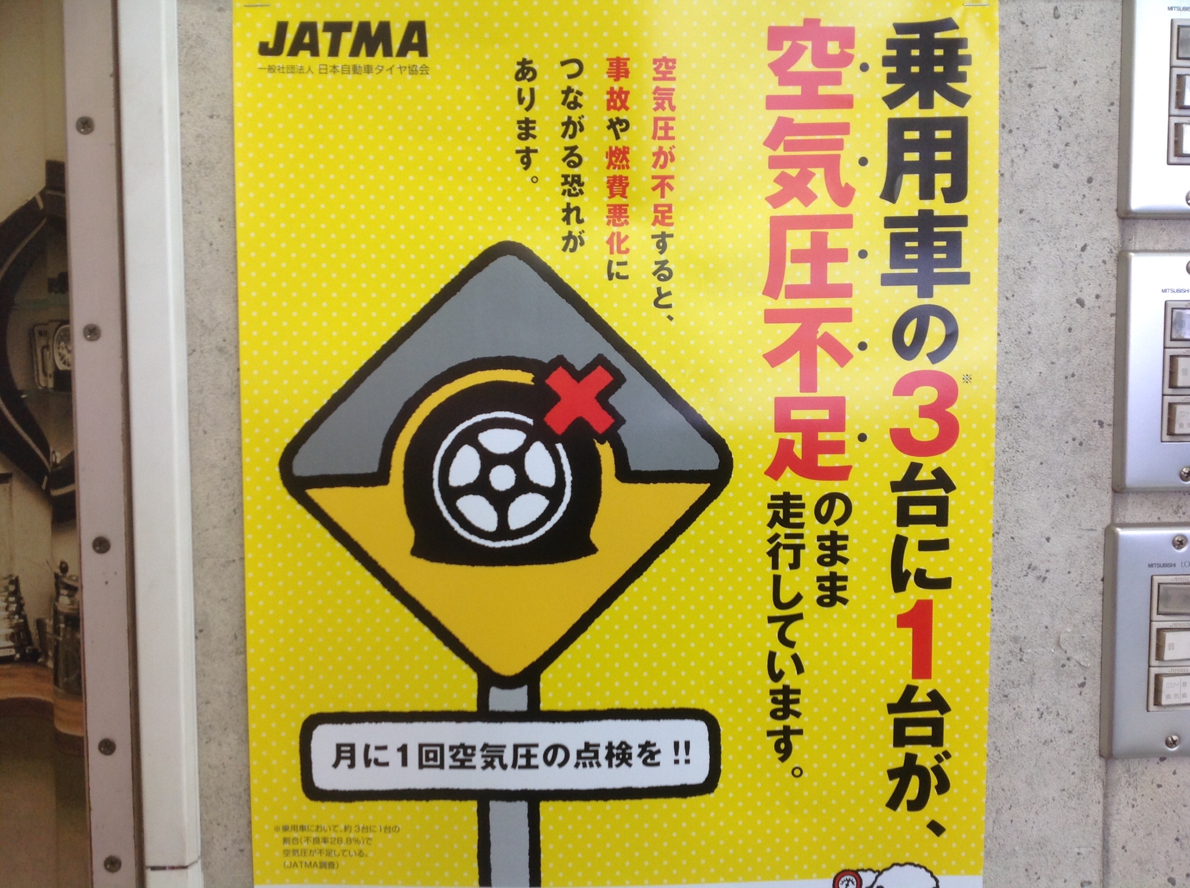 タグ:ブリヂストン タイヤ館 さいたま新都心 JATMA(日本自動車タイヤ協会 ) 3台に1台は空気圧が不足しています 定期的な点検を