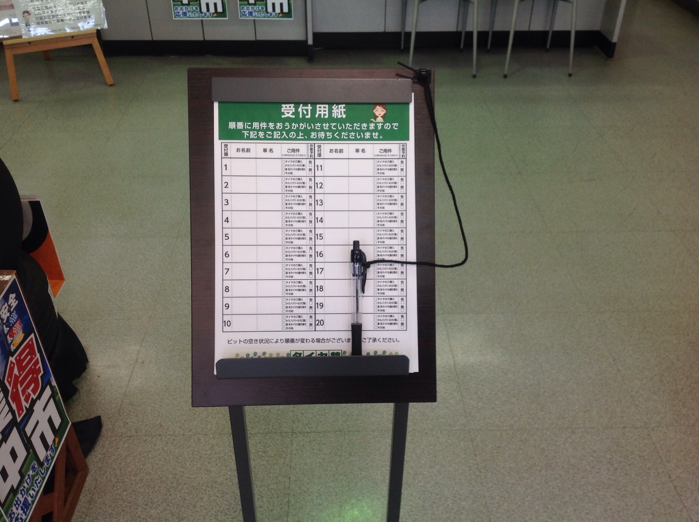 お手数ですが、お名前と車種をご記入いただき、待合にてお待ちくださいませ。