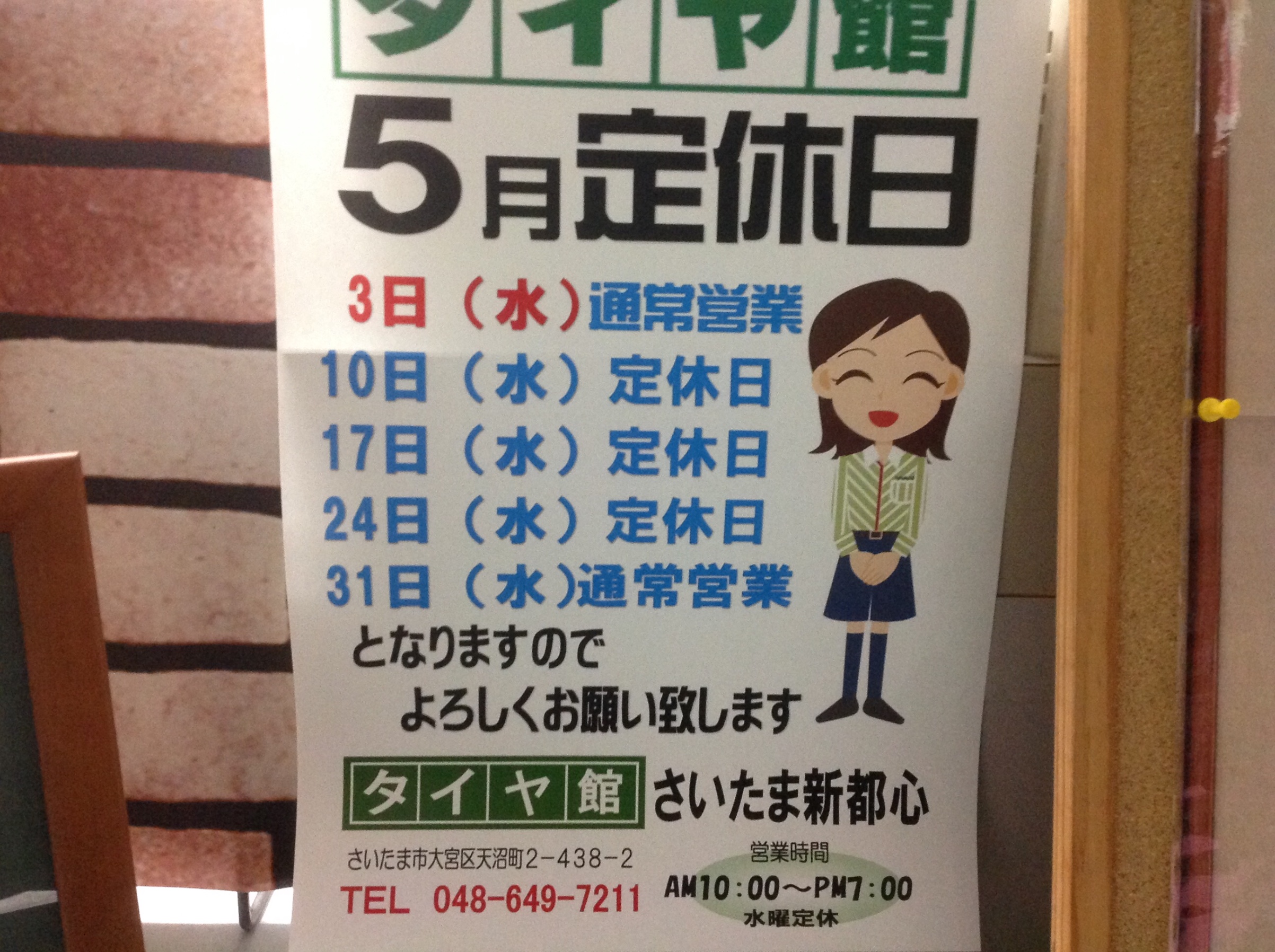 G.W中は休まず営業致します。 ポスト 2017年5月2日 こんにちは。 スタッフ長谷部でございます。 いよいよ大型連休本番ですが、連休中もタイヤ館さいたま新都心は通常営業です。 お車の事で何か御用の際はお気軽にご来店ください。 スタッフ一同皆様のご来店をお待ちしています。 注)連休中は混み合うことが予想されますので、ご来店の際はお時間に余裕を持ってお願い致します。 タグ:タイヤ館 さいたま新都心 G.W 当店は通常営業です