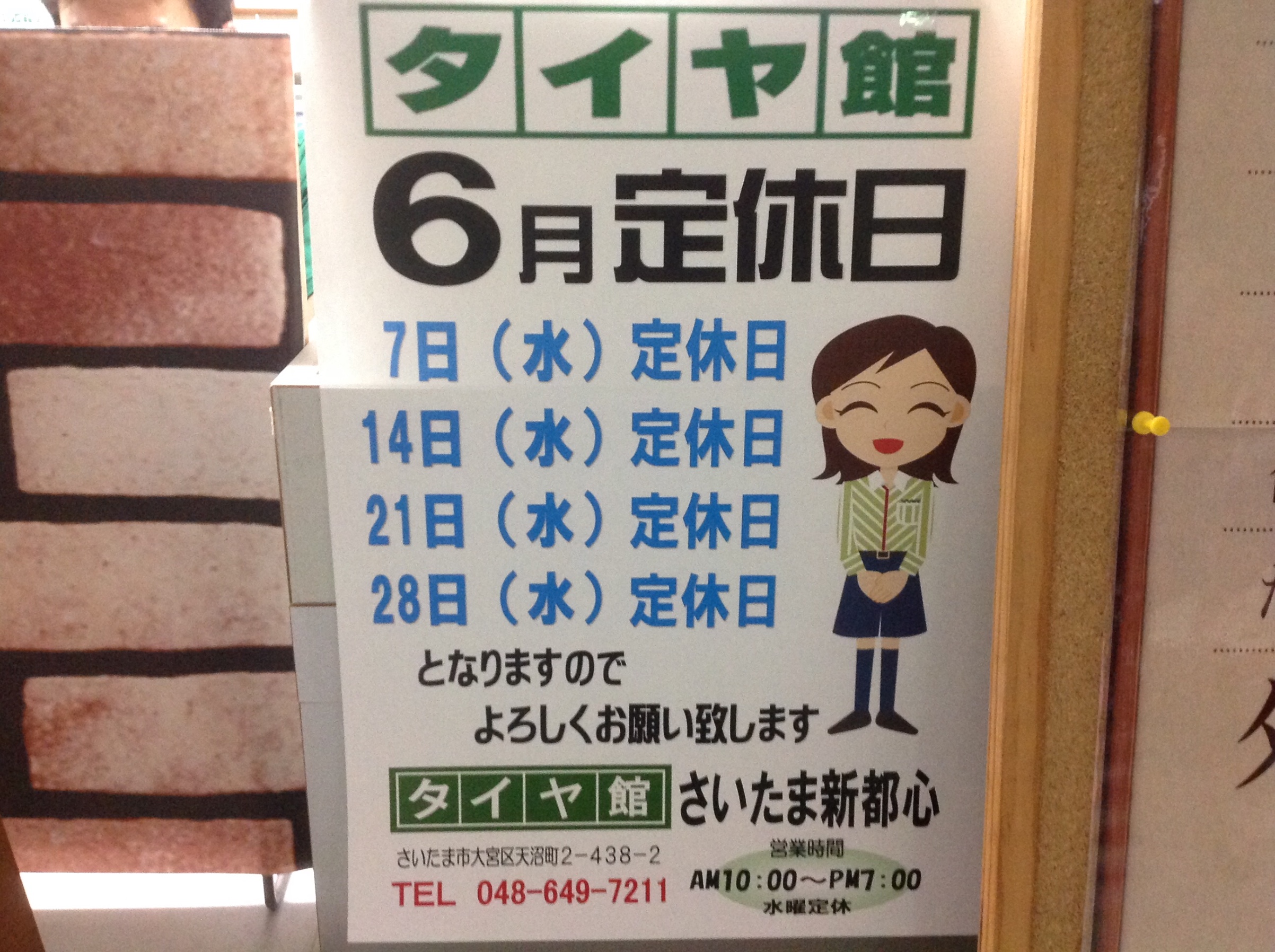 今月の定休日のお知らせ。 ポスト 2017年6月1日 6月の定休日は7日・14日・21日・28日の水曜日です。 今月は毎週定休日がありますので、御用の際はご確認の上ご来店ください。 よろしくお願い致します。 タグ:タイヤ館 さいたま新都心 定休日