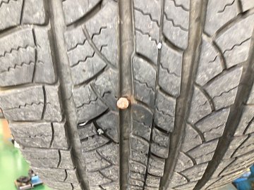 当店のホームページをご覧頂きありがとうございます!こんにちは! ☆タイヤ館さいたま新都心店です!!☆ 外面パンク修理の実例です。 釘が刺さってご来店です まずは釘を抜きます。 抜いた部分を器具を使用し修理剤を入れる為に、穴をキレイに開けなおします。 その後修理剤に接着剤を付けてパンク箇...