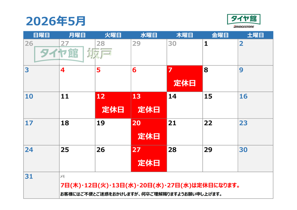 ☆゚・*:.。.☆゚ 5月の定休日のおしらせ ☆゚・*:.。.☆゚ 2026年4月26日 5月の定休日のお知らせ 5月 7日(木) 5月12日(火) 5月13日(水) 5月20日(水) 5月27日(水) は、定休日となります。 ご利用のお客様にはご不便とご迷惑をおかけしますが、何卒ご理解賜りますようお願い申し上げます。