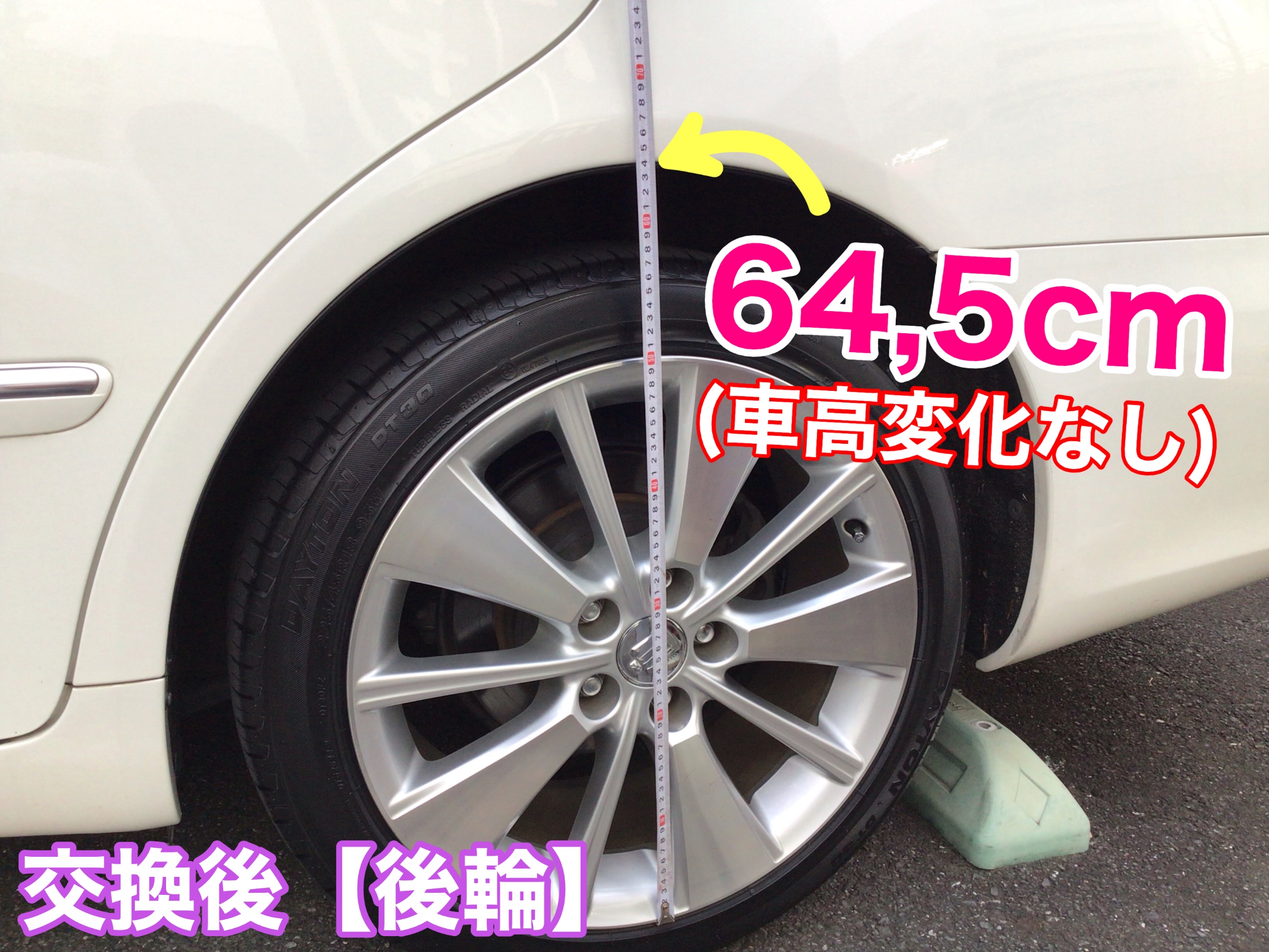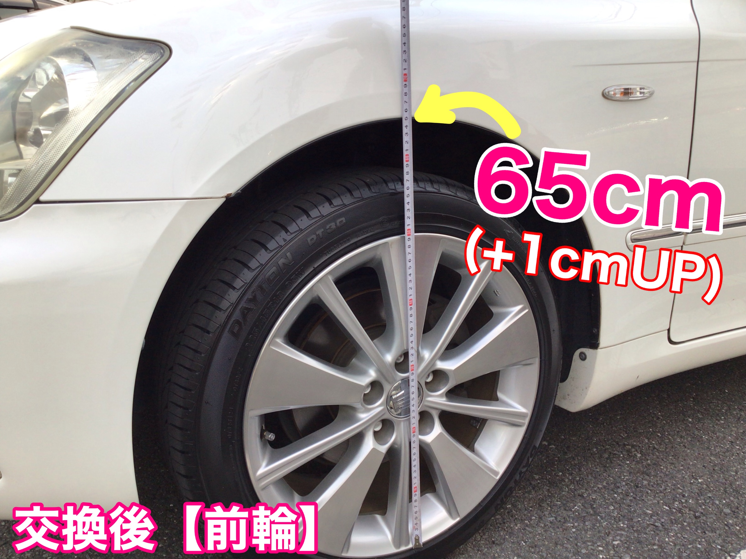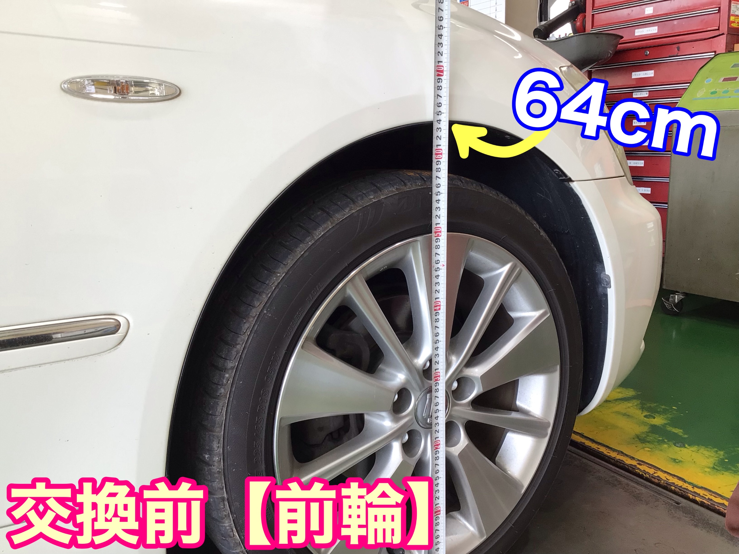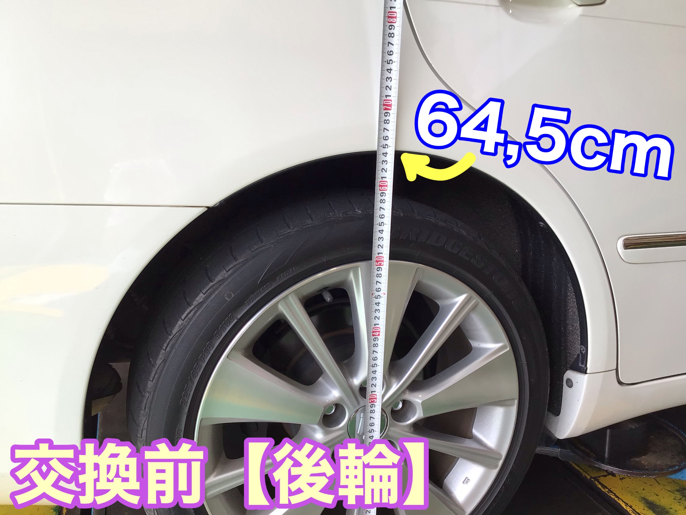 ショックのくたびれによる車高の変化が確認出来る様【交換前後】に車高の測定を