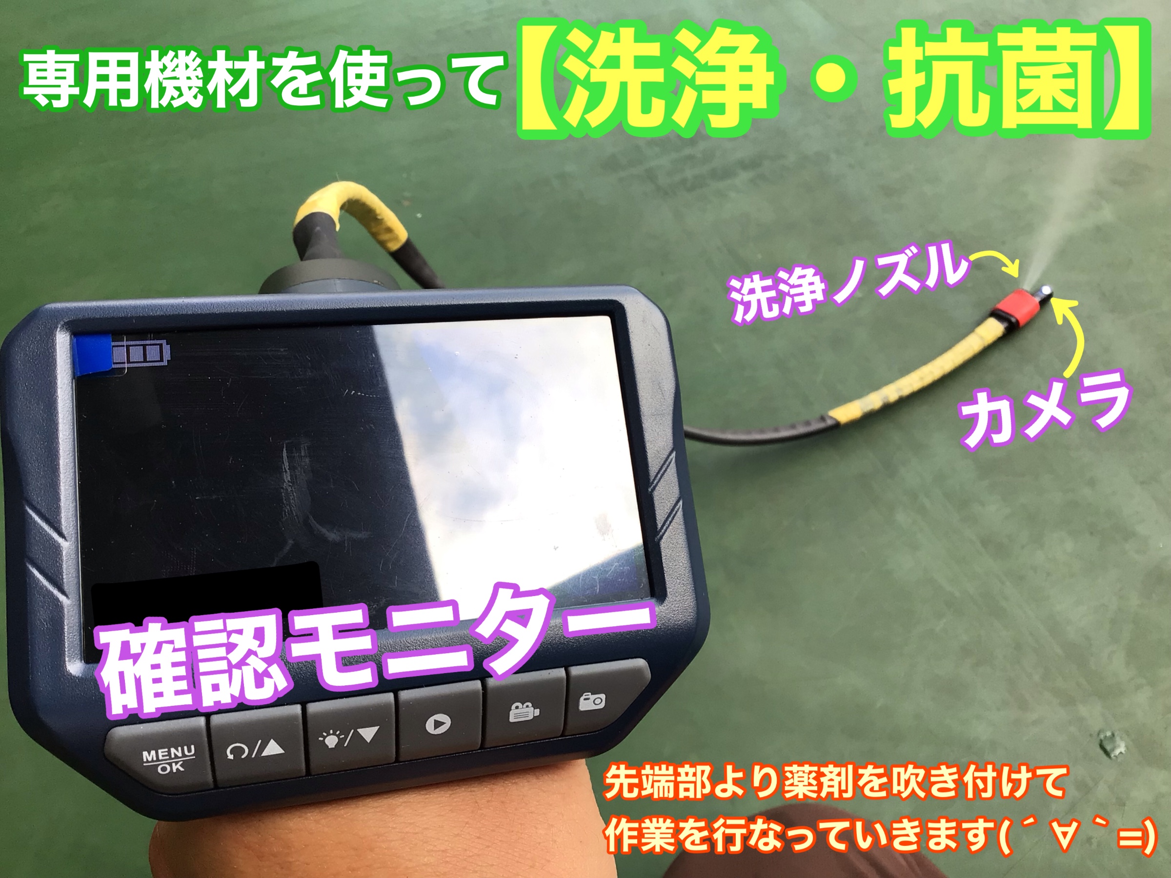 画面に映し出された状態を確認しながら洗浄部分を変え全体を洗っていきます‼︎