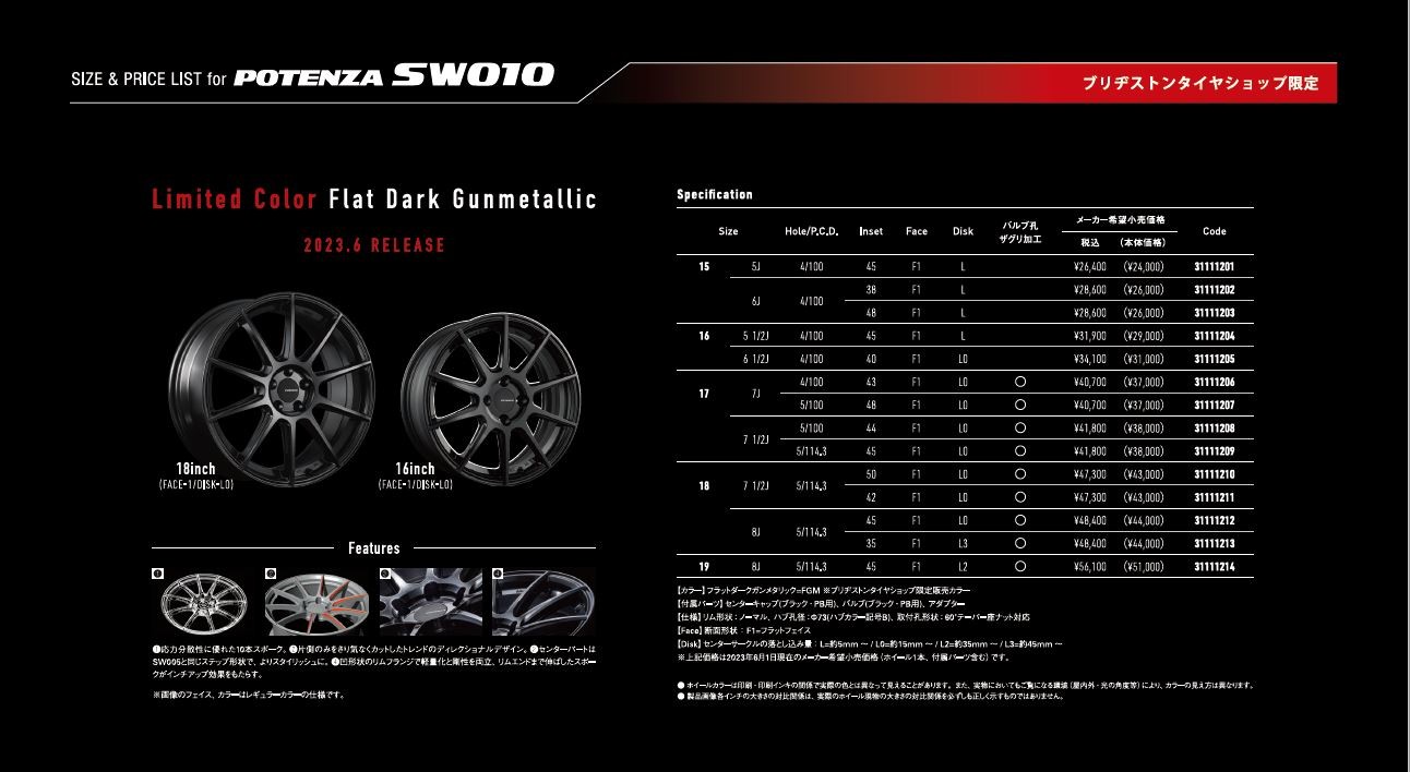 展示品入荷案内 人気のスポーツホイール「POTENZA SW010」に取り扱い限定カラー登場!絶賛展示中です。