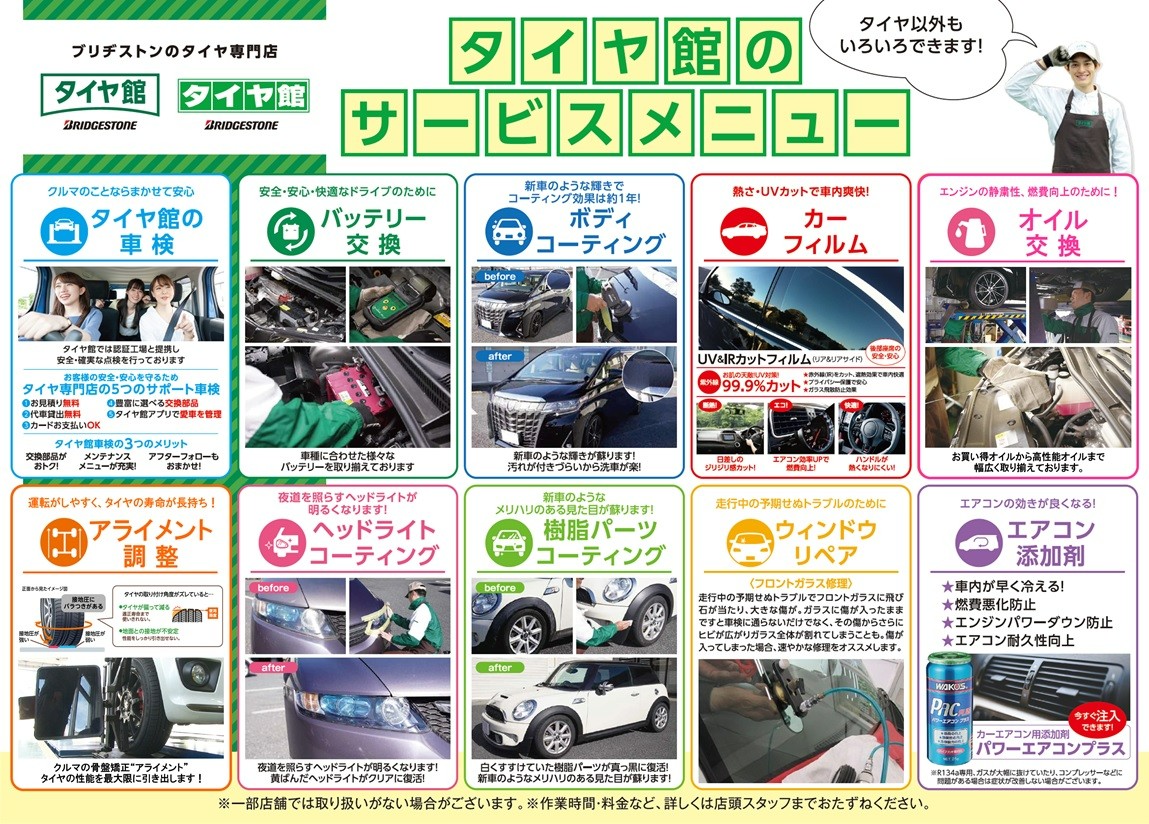 【検索用】 タイヤ交換・オイル交換・バッテリー・タイヤ・空気圧管理・パンク・メンテナンス・修理・タイヤ館・点検・脱着・エンジンオイル交換・バッテリー交換・安い・パンク・エアコンフィルター・ワイパー交換・エアコン添加剤・エアコン洗浄・ワコーズ・WAKOS・パワーエアコン・ヘッドライトコーティング・窒素ガス・空気圧点検・アライメント調整・ブリヂストン・ブリジストン・BS・レグノ・BRIDGESTONE・REGNO・POTENZA・PLAYZ・ECOPIA・NEXTRY・BLIZZAK・マルチウエザー・オールシーズンタイヤ・プレイズ・エコピア・ネクストリー・ニューノ・ポテンザ・デューラー・アレンザ・商用車タイヤ・軽トラ・ハイエース・ブリザック・ATF交換・CVT・オイルフィルター・車内消臭・安いタイヤ・デイトン・DAYTON・セイバーリング・ガラスコーティング・ボディーコーティング・カーコーティング・フッソ・カーフィルム・樹脂パーツコーティング・防錆コーティング・錆止め・オイル交換安い・カーフィルム・ガラス修理・ウインドウリペア・ニューテック・R254・R407・TEIN・テイン・RS-R・タナベ・HKS・トラスト・アペックス・サード・ブリッツ・TRD・ニスモ・無限・STI・データシステム・RECARO・レカロ・PIVOT・ピボット・玄武・GENBU・ブリッド・BRIDE・クスコ・CUSCO・ベレッツァ・クラッチオ・柿本 改・カキモトレーシング・フジツボ・ユピテル・コムテック・ドライブレコーダー・TPMS・空気圧センサー・ユピテル・コムテック・ドライブレコーダー・パイオニア・パナソニック・バッテリー・カオス・GS・タイヤ館・タイヤ館坂戸・坂戸市・鶴ヶ島市・北坂戸市・日高市・鳩山町・毛呂山町・高坂・若葉・飯能市