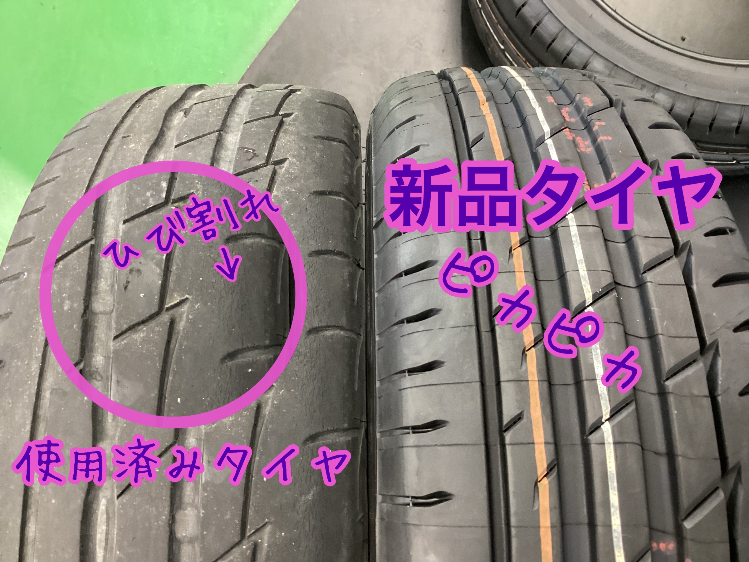 使用済みのタイヤと新品のタイヤを