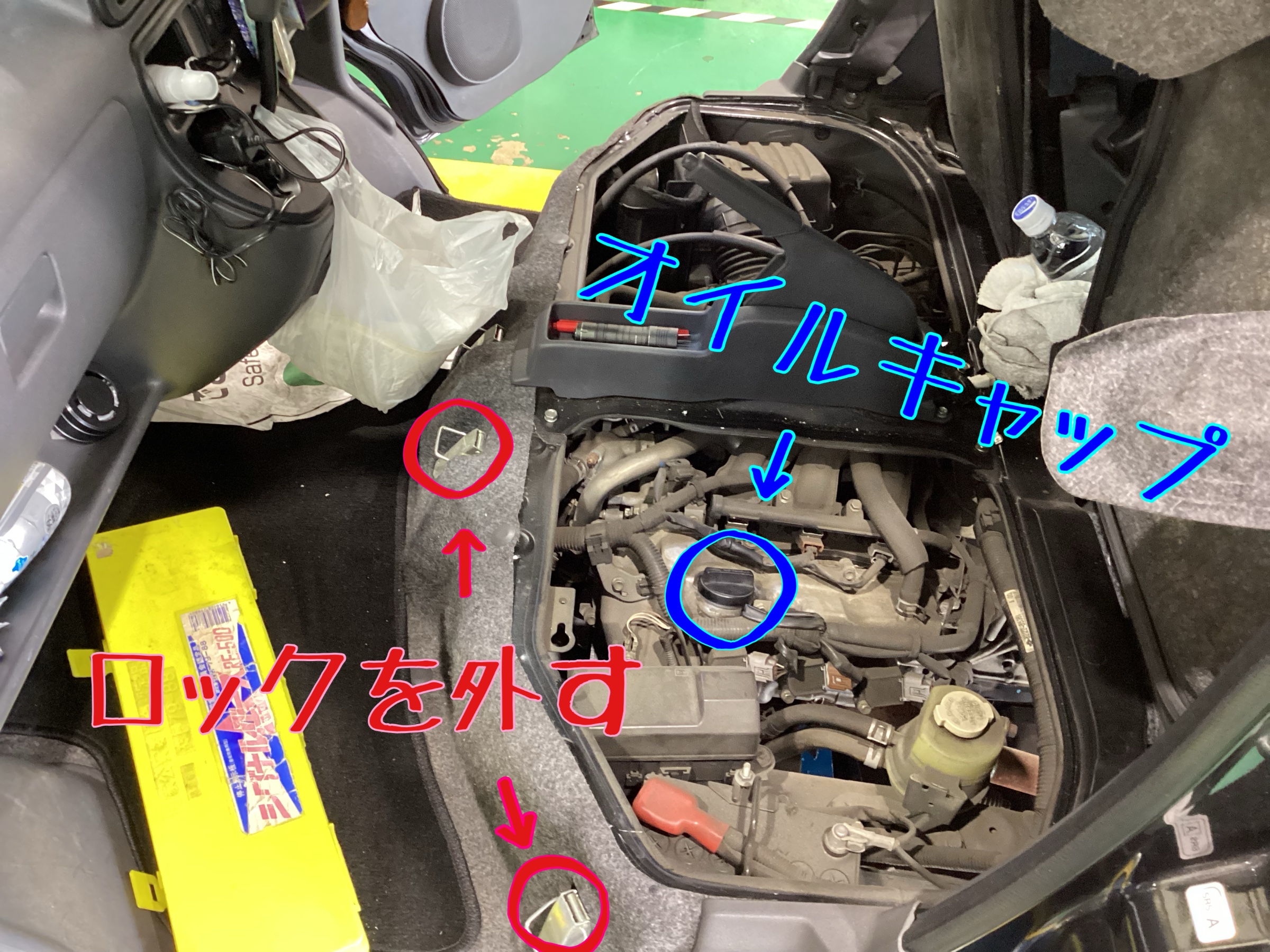 この車は、運転席の下にオイルレベルゲージ、助手席の下にオイルの注ぎ口があるため、まずは座席を持ち上げます。