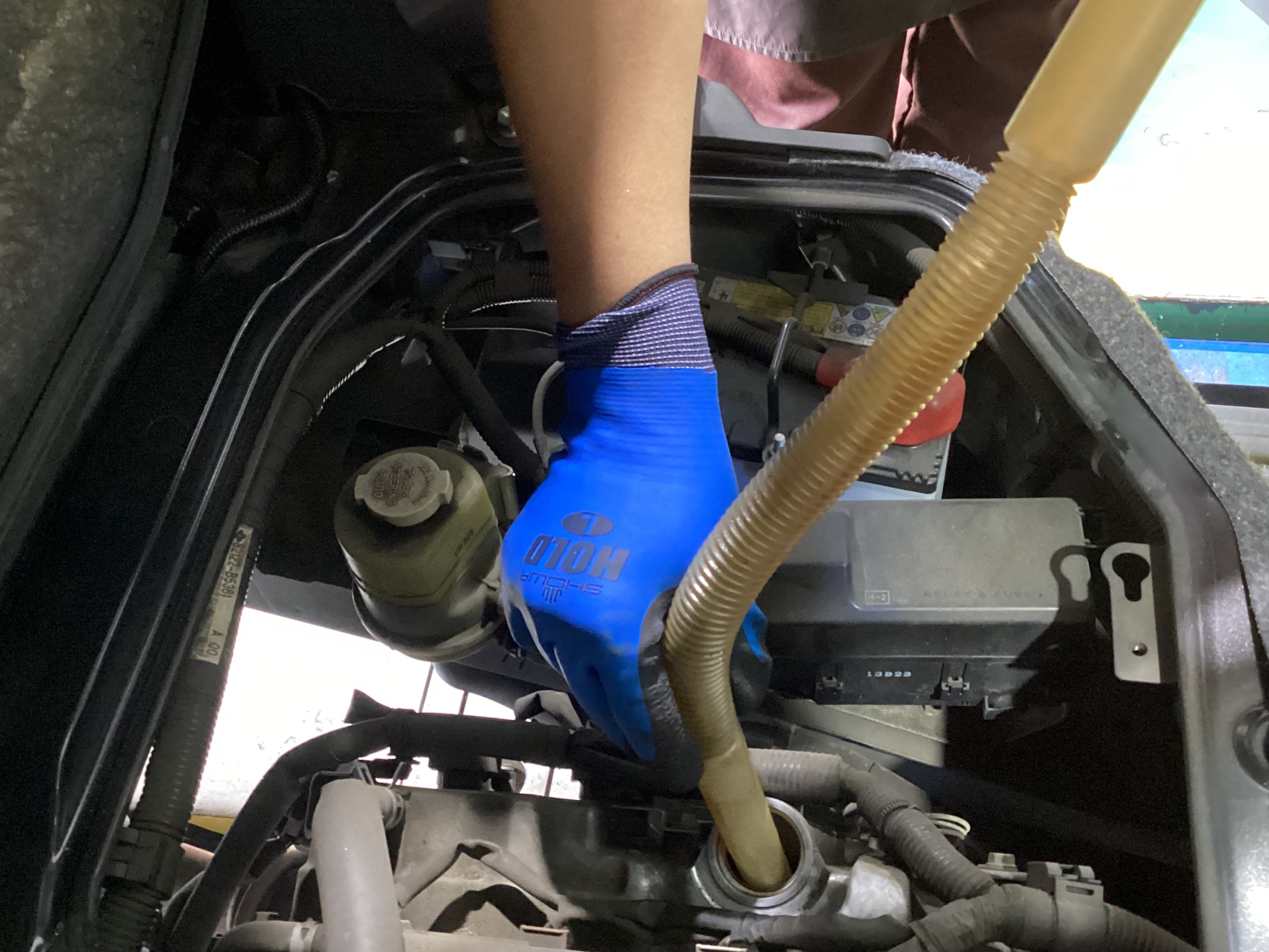 オイルを注ぐ際は、オイルをこぼしたり、他のところを触ったりぶつけたりしてお客様の車が汚れたり、傷ついたりしないよう、注意しつつ、慎重にオイルを注いでいきます。