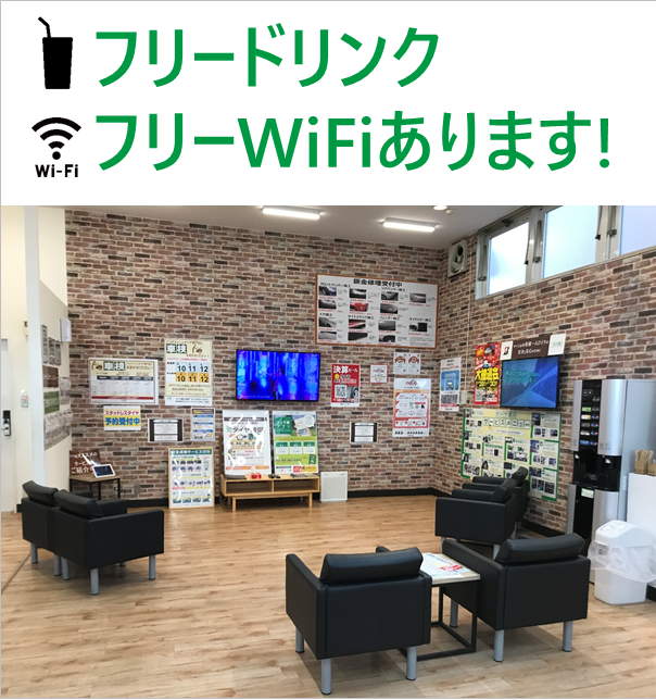 タイヤ館坂戸では、フリーWi-Fi、フリードリンクをご用意しております!お子様連れも大歓迎!