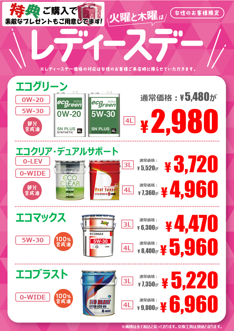 火曜と木曜はレディースデー☆彡.。.:* ポスト 2024年6月9日 火曜日と木曜日はレディースデイです(^^♪ 女性のお客様はオイル交換がお得に出来るチャンスです♬ 火曜日と木曜日はタイヤ館でお得にオイル交換しちゃいましょう♪♪ カテゴリ:お知らせ