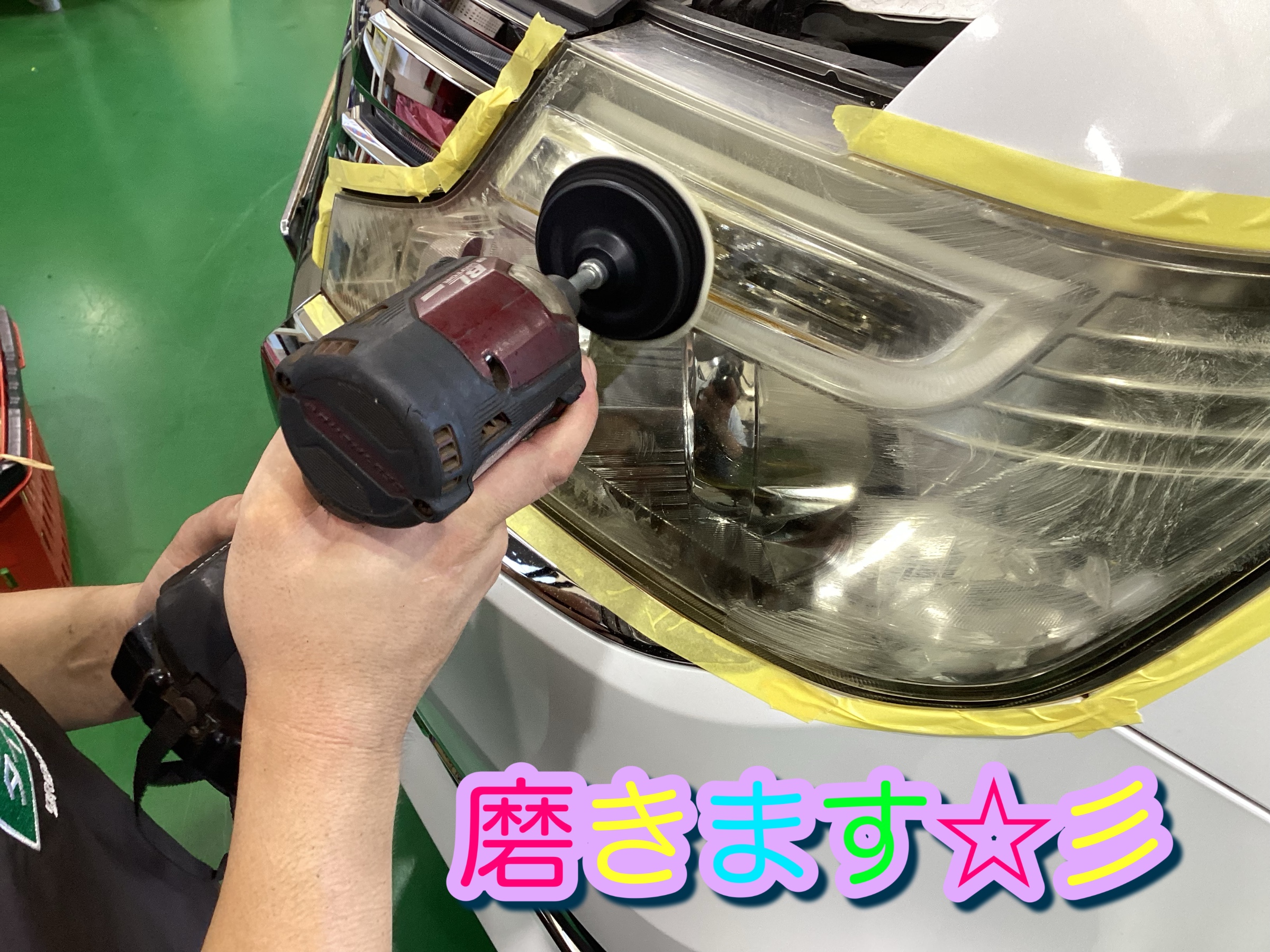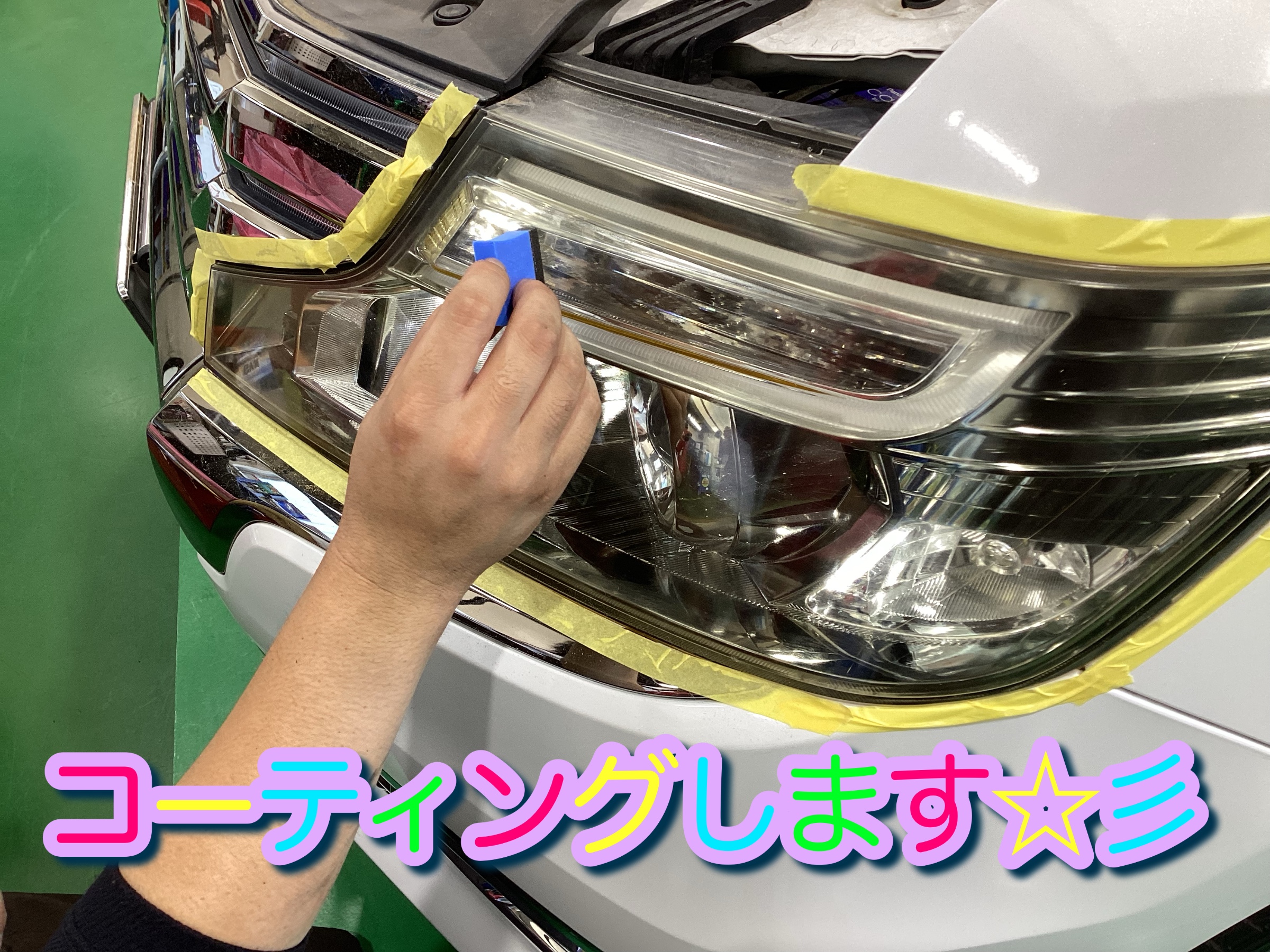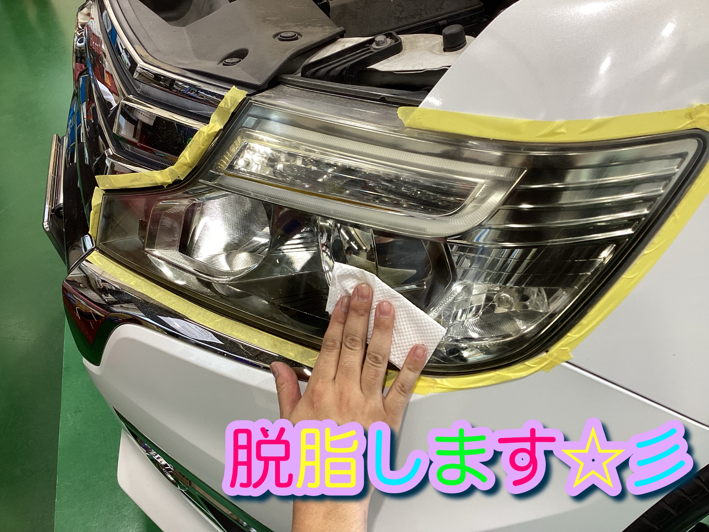 ヘッドライトの表面を綺麗にし、周囲をしっかりとマスキングします‼︎