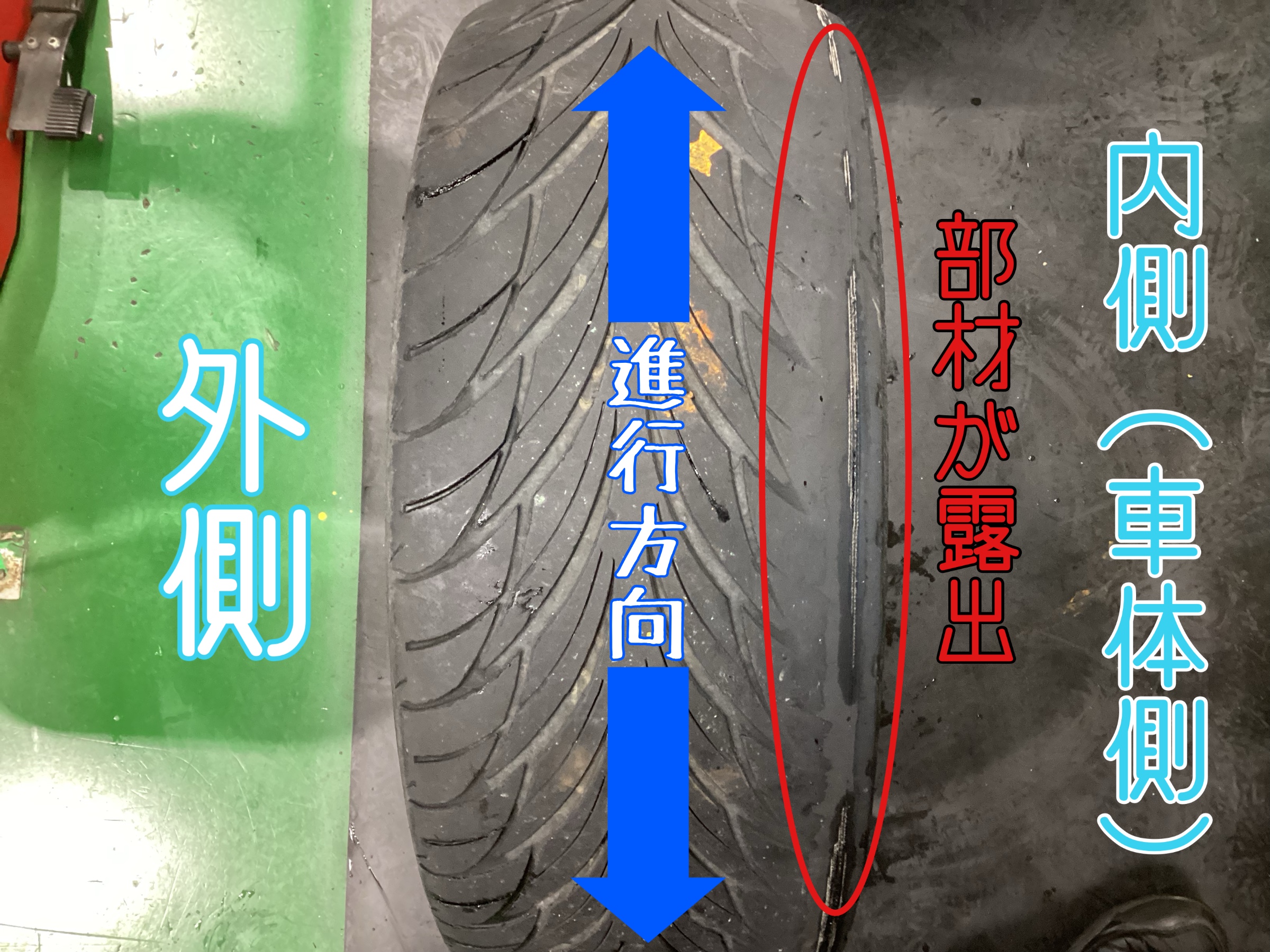 タイヤ内部の部材が露出していたため、