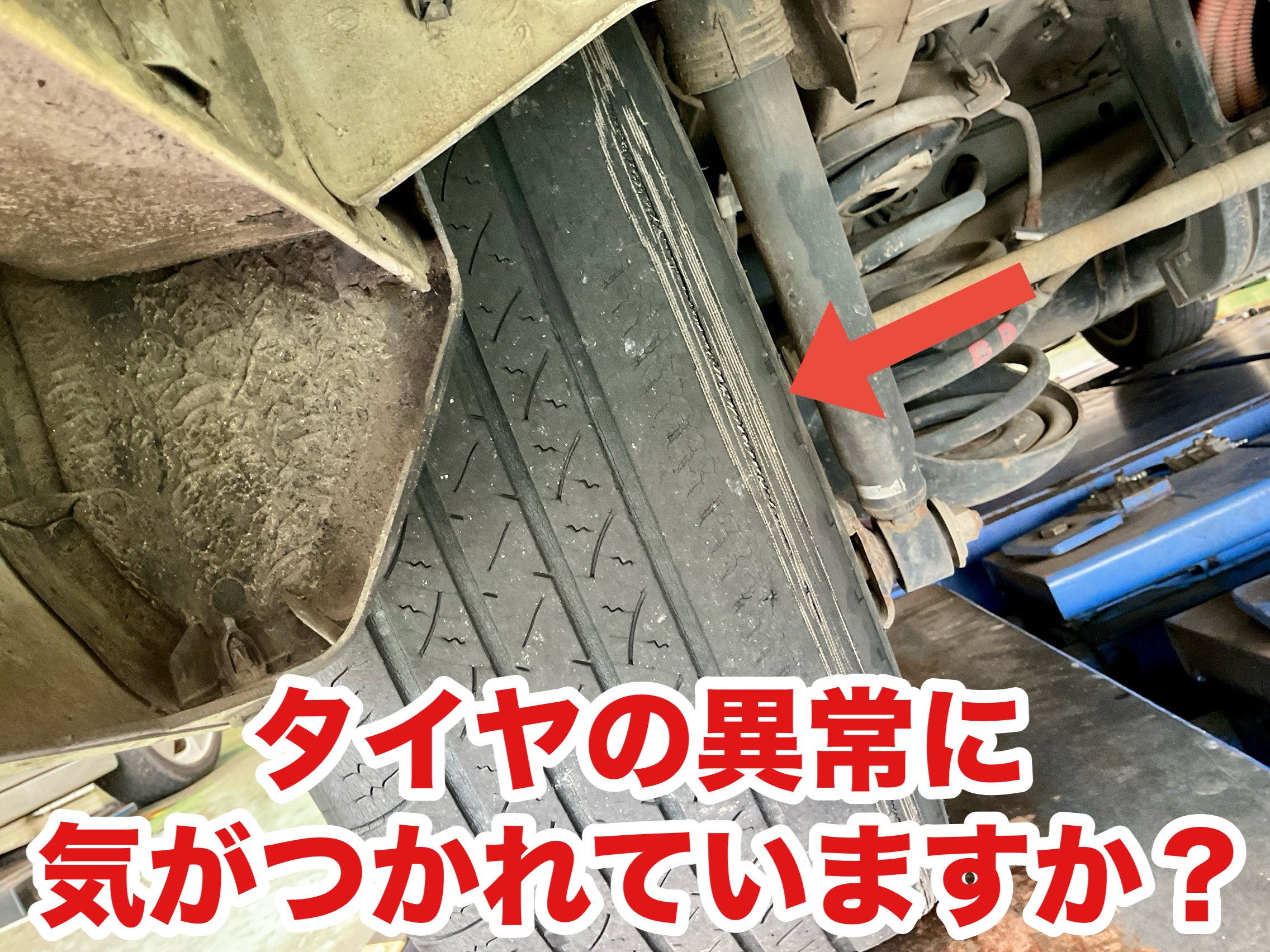 こちらは当店に別の作業で来店された車両ですがリフトアップしたところ、タイヤ内側からワイヤーが露出!