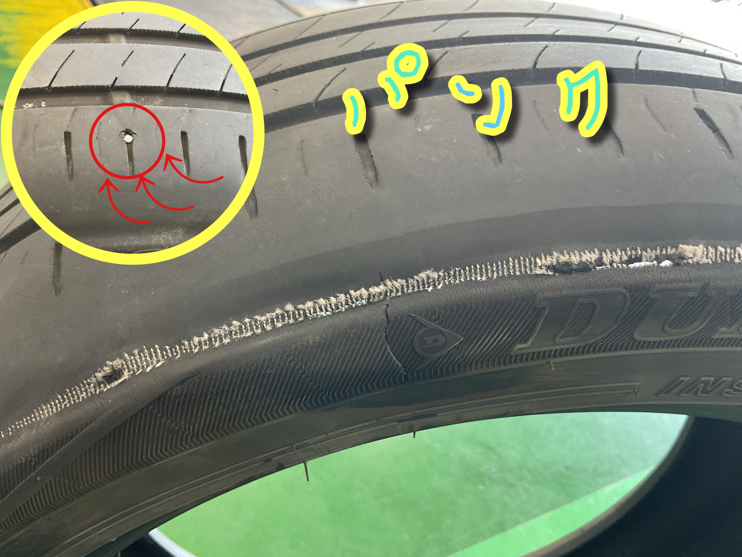 そこから空気が抜けてしまい、走行したためタイヤが著しく損傷しています。