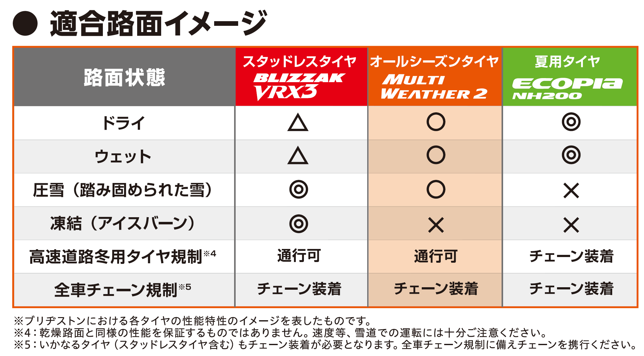 ドライグリップ性能、ウェットグリップ性能は、夏タイヤ同等の性能を確保(当社ベーシックタイヤ対比)冬季以外も安心感を持って運転頂けます。