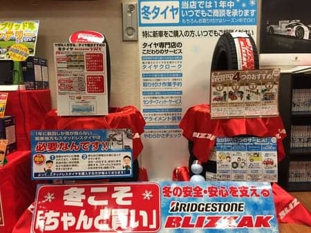 先日、待合コーナーにスタッドレス展示を作りました。