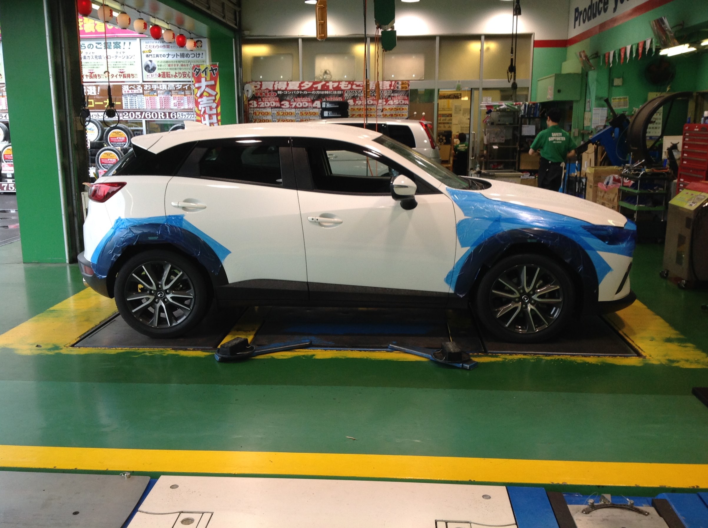 作業前にはお車にキズなどつけないようにシッカリと養生をしてから作業スタートです!