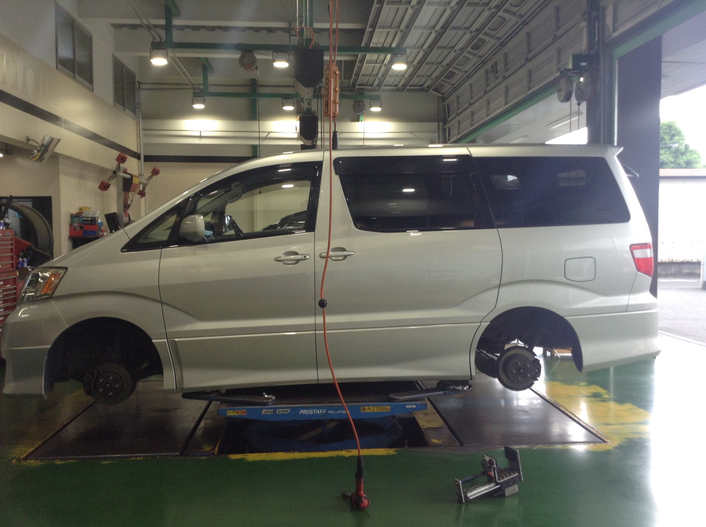大型ミニバン車両:アルファードも四輪リフトアップで作業致します。