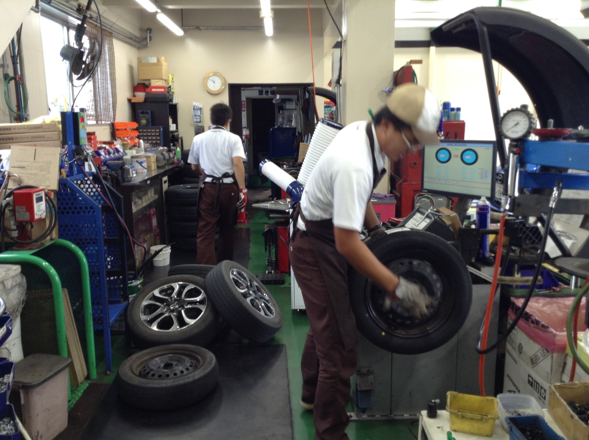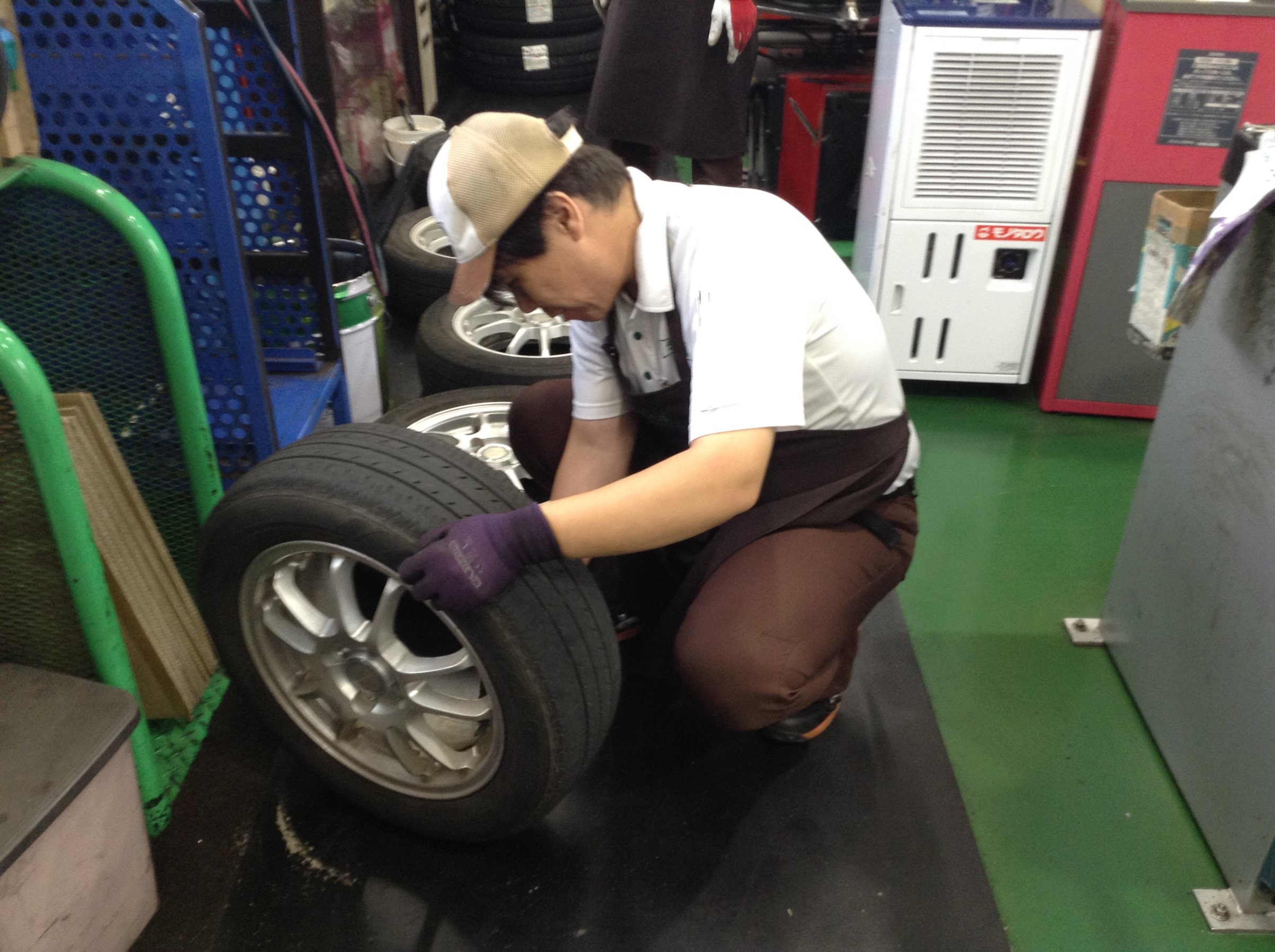 細かく交換タイヤホイールをチェックしている斉藤社員デス。