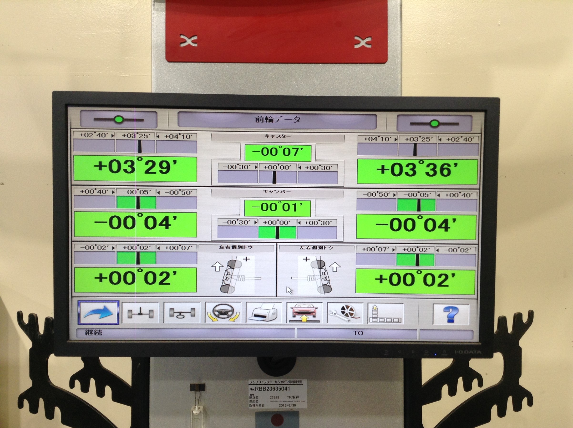 タイヤの角度左右を画面に映し確認し調整に入ります。
