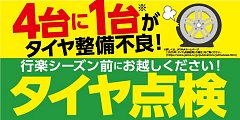 行楽のシーズンになりましたね。 お出かけ前にタイヤ点検は いかがですか? タイヤ館では無料で専用の機材を 使いしっかりとタイヤ点検を 行っています! 残溝点検・空気圧点検などのチェックを 行い、最後にタイヤワックスで ピカピカに!! お出かけ前にお気軽にご来店ください。