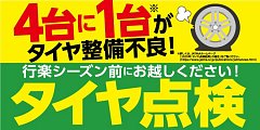 お出かけ前にタイヤ点検は いかがですか? タイヤ館では無料で専用の機材を 使いしっかりとタイヤ点検を 行っています! 残溝点検・空気圧点検などのチェックを 行い、最後にタイヤワックスで ピカピカに!! お出かけ前にお気軽にご来店ください。