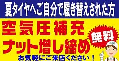 お履き替え、シーズン待ち時間が増え申し訳ございません >< 当店では、ご自分でお履き替え頂いたお客様へ『無料』で 空気圧チェック・ナットの増し締め・タイヤワックスの サービスを実施していますのでお気軽にご来店下さい。