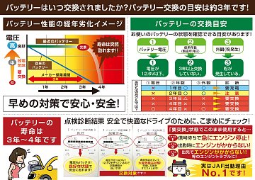 みなさん、こんにちは・こんばんは(*´∀`)ノシ タイヤ館坂戸店のホームページをご覧いただきありがとうございます(´ ▽ `) お車のバッテリーの、『バッテリー健康診断』を受付中です(^_-)-☆ お車のバッテリーはいつ頃交換されましたか? バッテリーのトラブルは年間を通して1番多いんです!! 事前にチ...