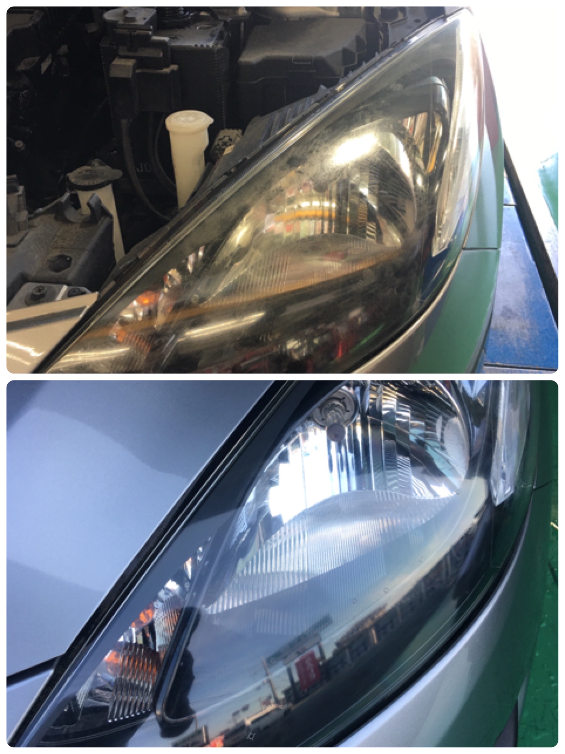 上が施工前で、ライトのバルブも見づらい状態でしたが、施工後はスッキリして綺麗になり、お客様にも満足していただきました。ありがとうございましたm(_ _)m