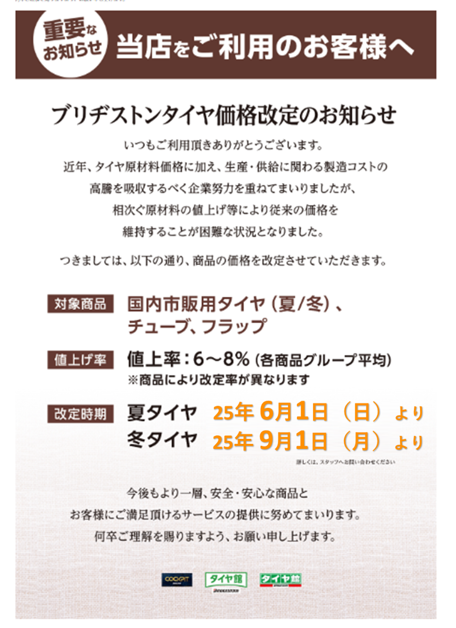 ブリヂストンタイヤ値上げのお知らせ!!