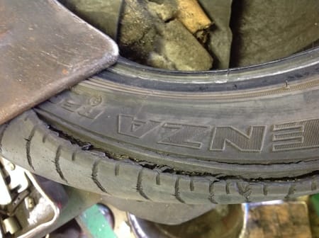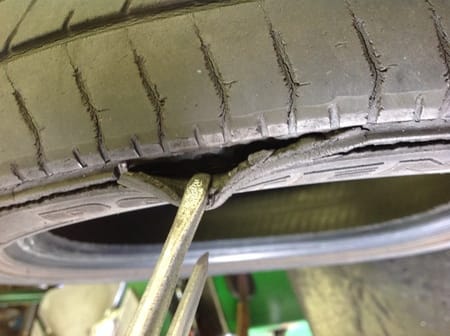 スズキのワゴンRスティングレーでご来店され、当初は「遠方まで行くのとバッテリーが弱ってきたから」ということでバッテリー交換でのご来店でしたが、いざタイヤをチェックしてみるとご覧の通り…サイドウォールがパックリ…(^◇^;)