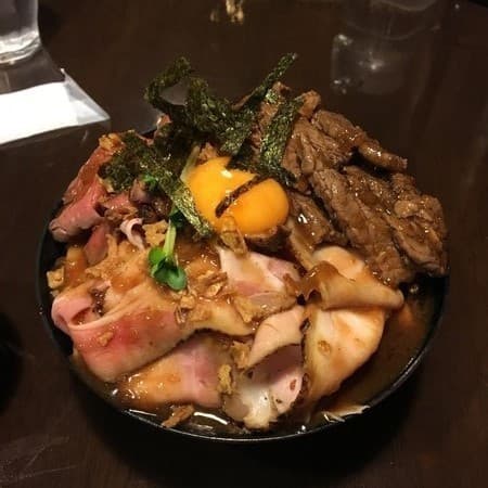 看板メニューの3種盛肉丼(ステーキ、ローストビーフ、ローストポーク)を頂きました。 (大)¥1190を注文しましたが (並)¥890 (小)¥790 もあります。+¥10でみそ汁がついてきます(≧∇≦)