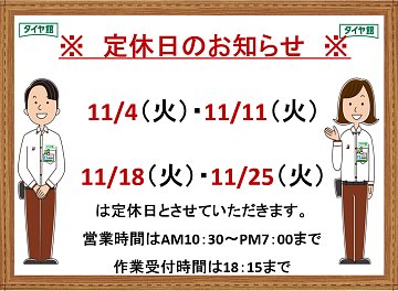 ⭐︎定休日のお知らせ⭐︎ 11月25日(火)定休日となります。ご注意ください♪ ただ大好評のタイヤ定額払いや通常タイヤ購入&作業予約も出来ます٩( 'ω' )و!