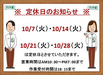 ⭐︎定休日のお知らせ⭐︎ 10月14日(火)定休日となります。ご注意ください♪ ただ大好評のタイヤ定額払いや通常タイヤ購入&作業予約も出来ます٩( 'ω' )و!