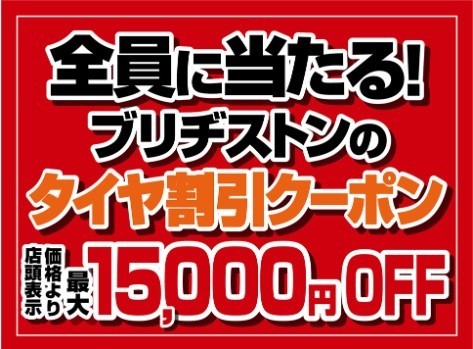 コクピット・タイヤ館のアプリをダウンロード頂いた方全員に、ブリヂストンのタイヤ割引クーポンをプレゼント!ブリヂストンのタイヤが最大15,000円OFF!プレミアムタイヤをお得にご購入頂けるチャンスです!