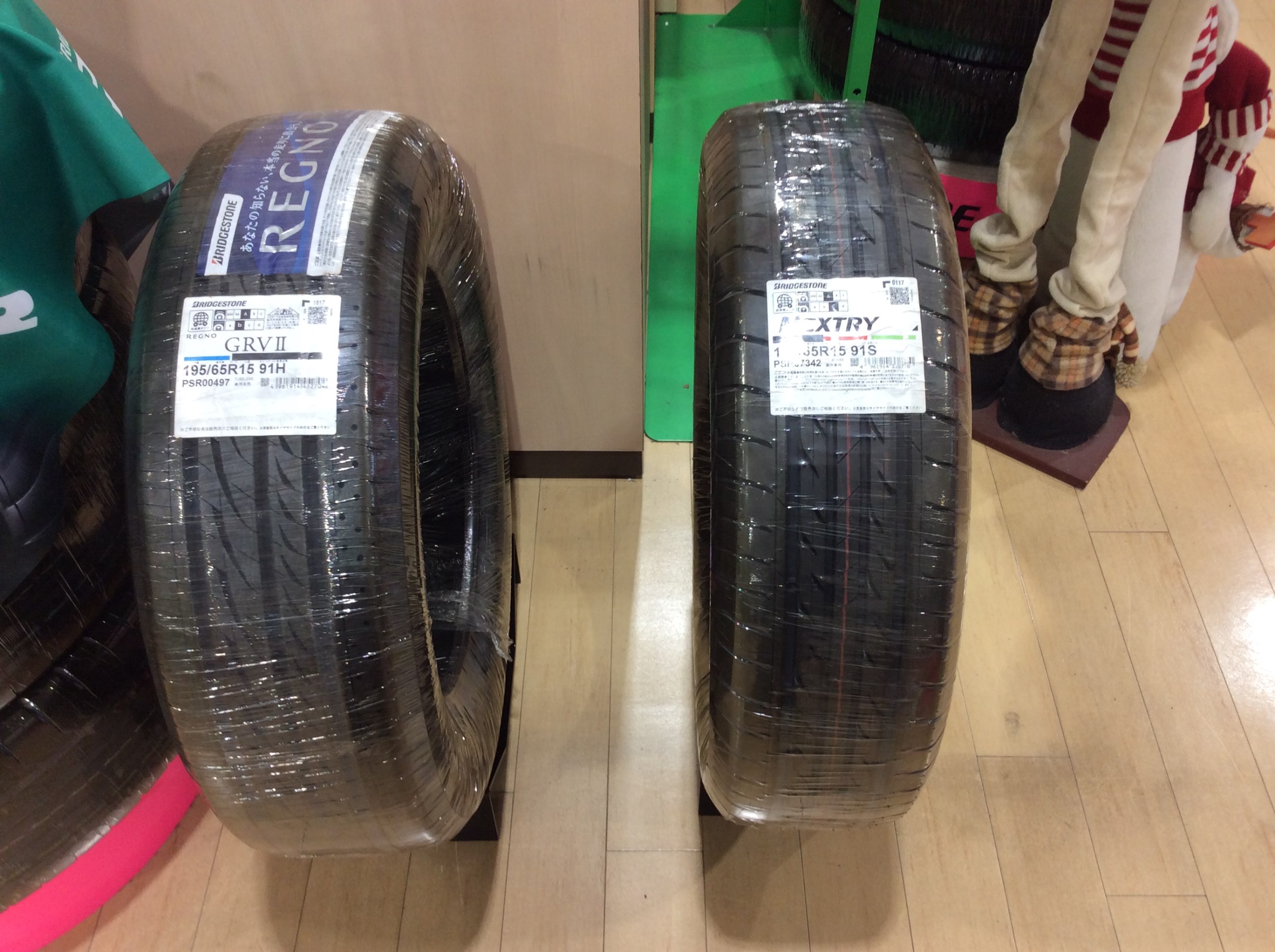 タイヤ館堺北の店舗内の一角に、このようにタイヤがポツンと2本立っているんです。