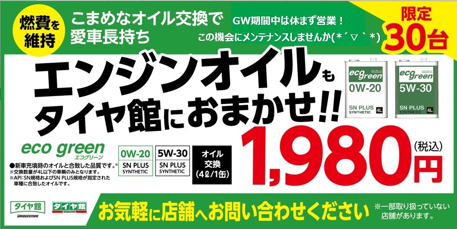 期間限定&数量限定、1台1,980円(税込、4L)でおトクにオイル交換!!