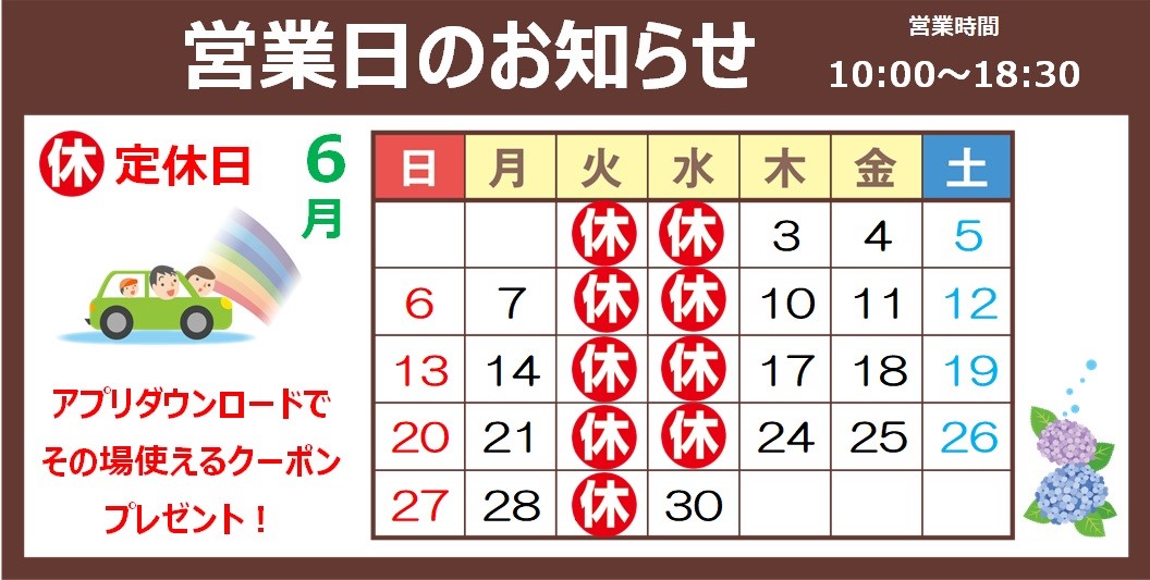 6月定休日のお知らせ ポスト 2021年5月31日 6月の定休日は毎週火曜・水曜日となります。 *6/30(水)は営業致します(*´▽`*) ご来店時はご確認お願い致します。m(__)m カテゴリ:お知らせ