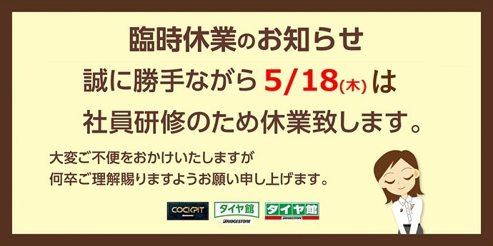 5/18(木) 臨時休業のお知らせ ポスト 2023年5月14日 いつもタイヤ館酒田をご利用いただきまして ありがとうございます。 5/18(木)は社内研修のため 休業致します。 ご不便お掛け致しますが よろしくお願い致します。 カテゴリ:お知らせ